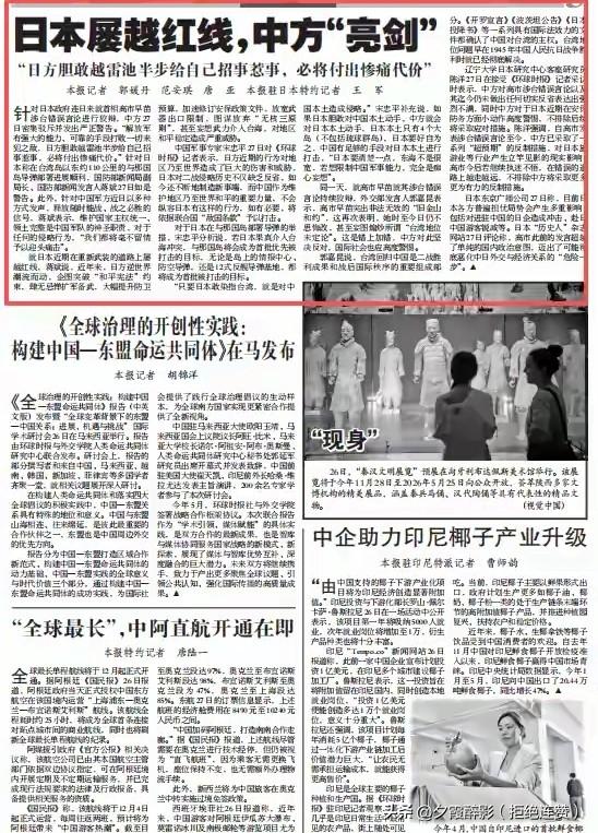 日本屡越红线 中方“亮剑”。日方胆敢越雷池半步给自己招事惹事,必将付出惨痛代价。 高市早苗公然炒作“台湾有事”,还拒不撤回错误言论,触碰中方核心红线。中方已启动“奉示召见”施压,劝告公民暂不赴日,日本旅游业已受冲击。 日本屡越红线 中方“亮剑”。日方胆敢越雷池半步给自己招事惹事,必将付出惨痛代价。 之前暂停日本水产进口,使其食品对华出口暴跌29.1%,稀土等关键资源中方占比超90%,日方依赖度近六成,真闹僵了高端制造得停摆。 日本屡越红线 中方“亮剑”。日方胆敢越雷池半步给自己招事惹事,必将付出惨痛代价。 解放军在台海、东海常态化演练,航母与“东风快递”形成威慑,日方若军事介入,无异于自寻死路,还会遭国际社会谴责。 中日关系的基础是一个中国原则,日方揣着明白装糊涂,为扩军搞挑衅,既违背历史共识,又损害自身利益。中国捍卫主权从不含糊,日方趁早收手才是明智之举。