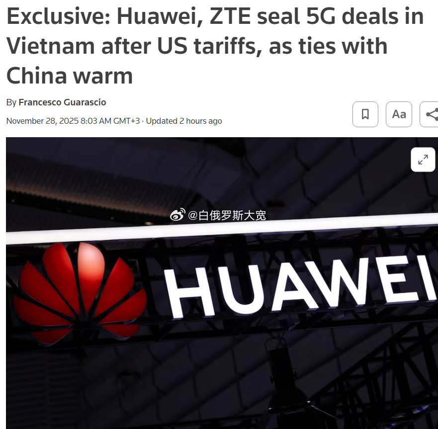 华为中兴在越南拿下5G大单 11月28日,据路透社报道,华为、中兴通讯今年已在越南获得了一系列5G设备供应合同。华为中标了一份价值2300万美元的5G设备合同。中兴则赢得了至少两份合同,其中一份于上周达成,5G天线订单总额超过2000万美元。报道称,美国对越南商品征收关税,导致双方关系趋冷。近几个月来,越南开始更积极地采用中国科技公司的技术。