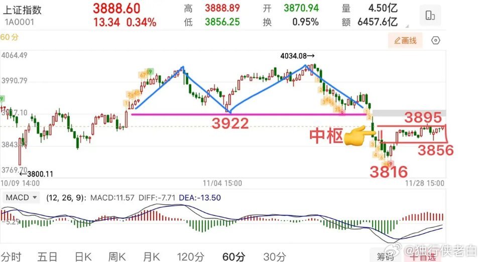 2025.11.28周五收评: 月线首阴,接下来备战12月。 今天是11月份最后一个交易日,整体还是小幅震荡整理为主,小阳线收盘,但力度一般,像这种小阴小阳线结构,对整体的结构影响不大,重要性也没有那么强,不改变整体格局。成交量变化是相对比较明显,两市1.57万亿,显然资金在这个位置还是没有积极做多的意愿,当然,这种缩量一般不会持续太久,耐心等待变盘即可。 技术面来看,从3816开始的向上反弹,继续围绕中枢在做震荡,只不过中枢在不断向右延伸,扩展。像这种创新高几个点,或者跌破几个点,都影响不大,最终都会拉回中枢继续折腾,要想改变这种格局,必须往上突破或向下跌破出3买或3卖才行。 所以,当下可以当作是中枢在不断延伸的过程,注意上下轨即可。往上需突破中枢上轨,回踩不进中枢。往下需跌破中枢下轨才能改变短期平衡。 从另外一个视角看,从3816开始的反弹,都可以当作是跌破3922M头颈线的反抽,在没有明显放量动作和转折讯号之前,对指数的预期就不要太高。 个人观点,仅供参考!