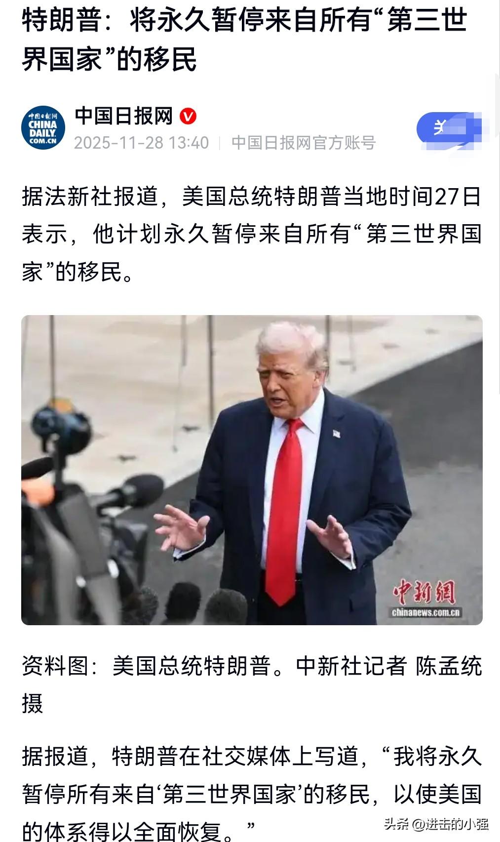 我有理由怀疑特朗普是一个种族歧视者。 当地时间11月27日。 特朗普:将永久停止第三世界国家移民。 还要把对国家没有贡献的移民驱逐出境。 他在这一点上和拜登相反,拜登就欢迎移民,特朗普就反对移民。 特朗普太保守和排外了。