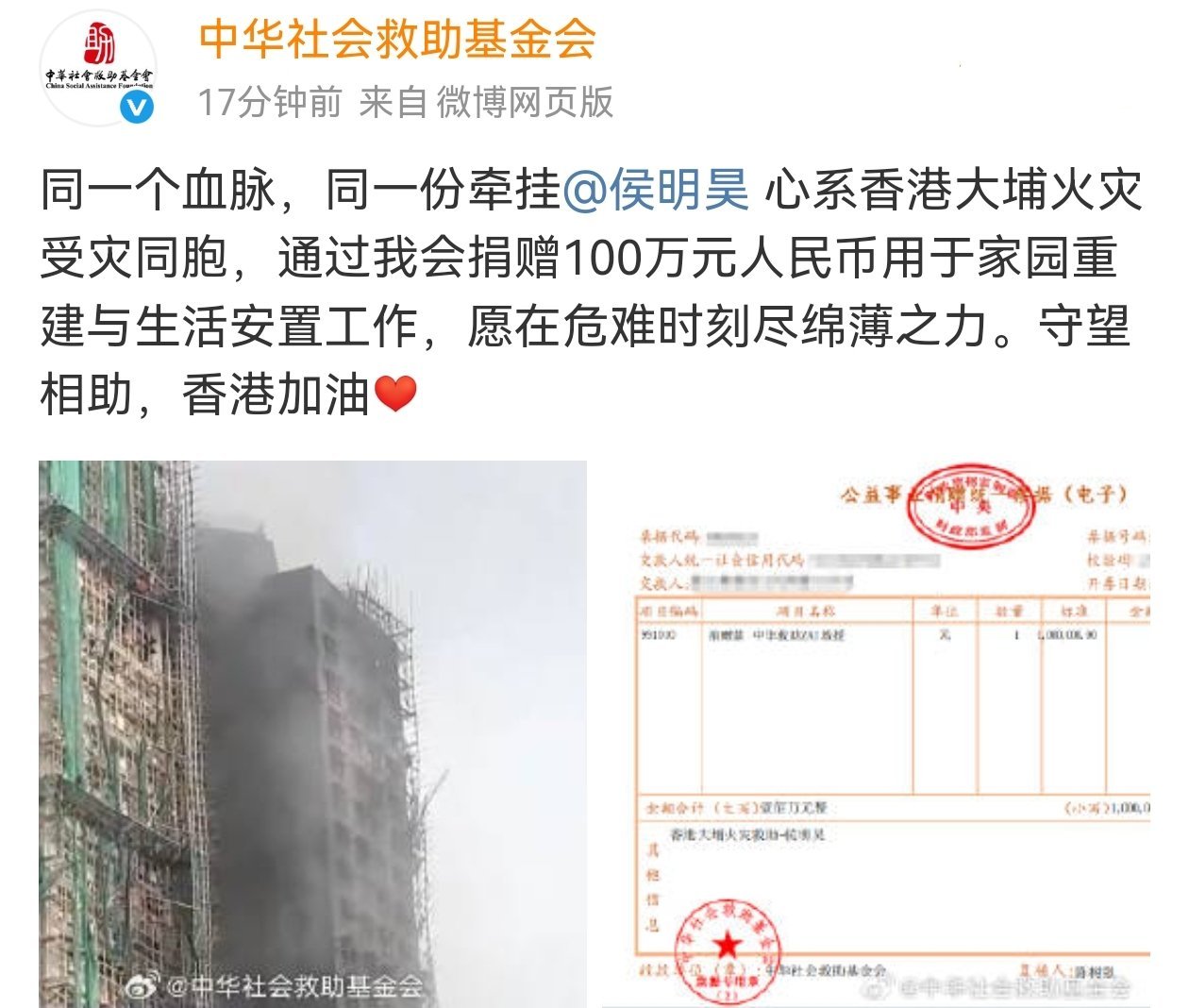 侯明昊为香港捐款100万 侯明昊为香港捐款100万,用于大埔宏福苑重建工作,帮助香港同胞早日渡过难关相信在大家帮助下,香港会早日恢复生机明星捐款
