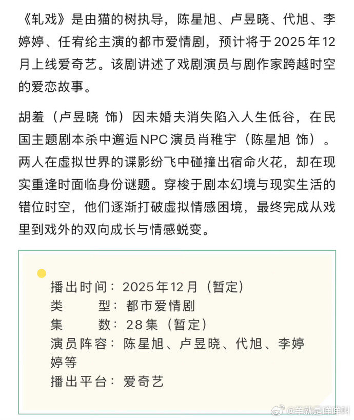 陈星旭卢昱晓的电视剧《轧戏》开启播前招商了,这部也是12月