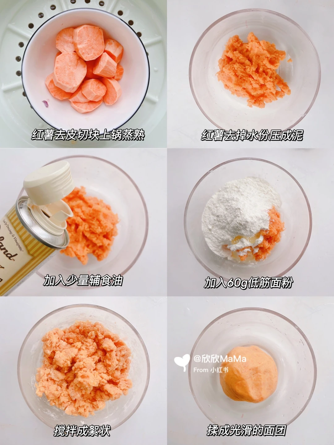 1️⃣红薯去皮切块上锅蒸熟,红薯去掉水份压成泥
