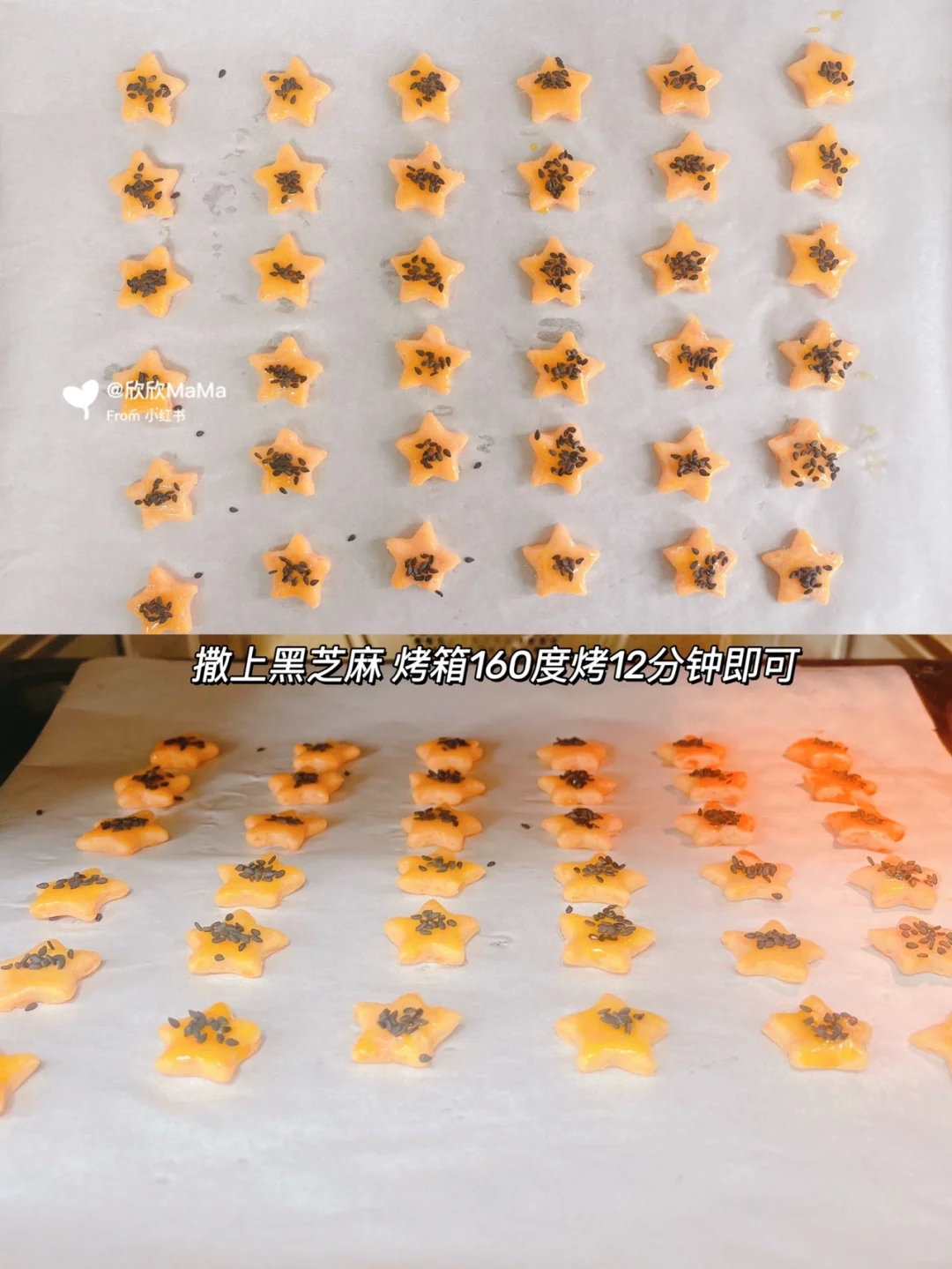 5️⃣摆入烤盘中,表面刷蛋黄液,撒上黑芝麻 烤箱160度烤12分钟即可