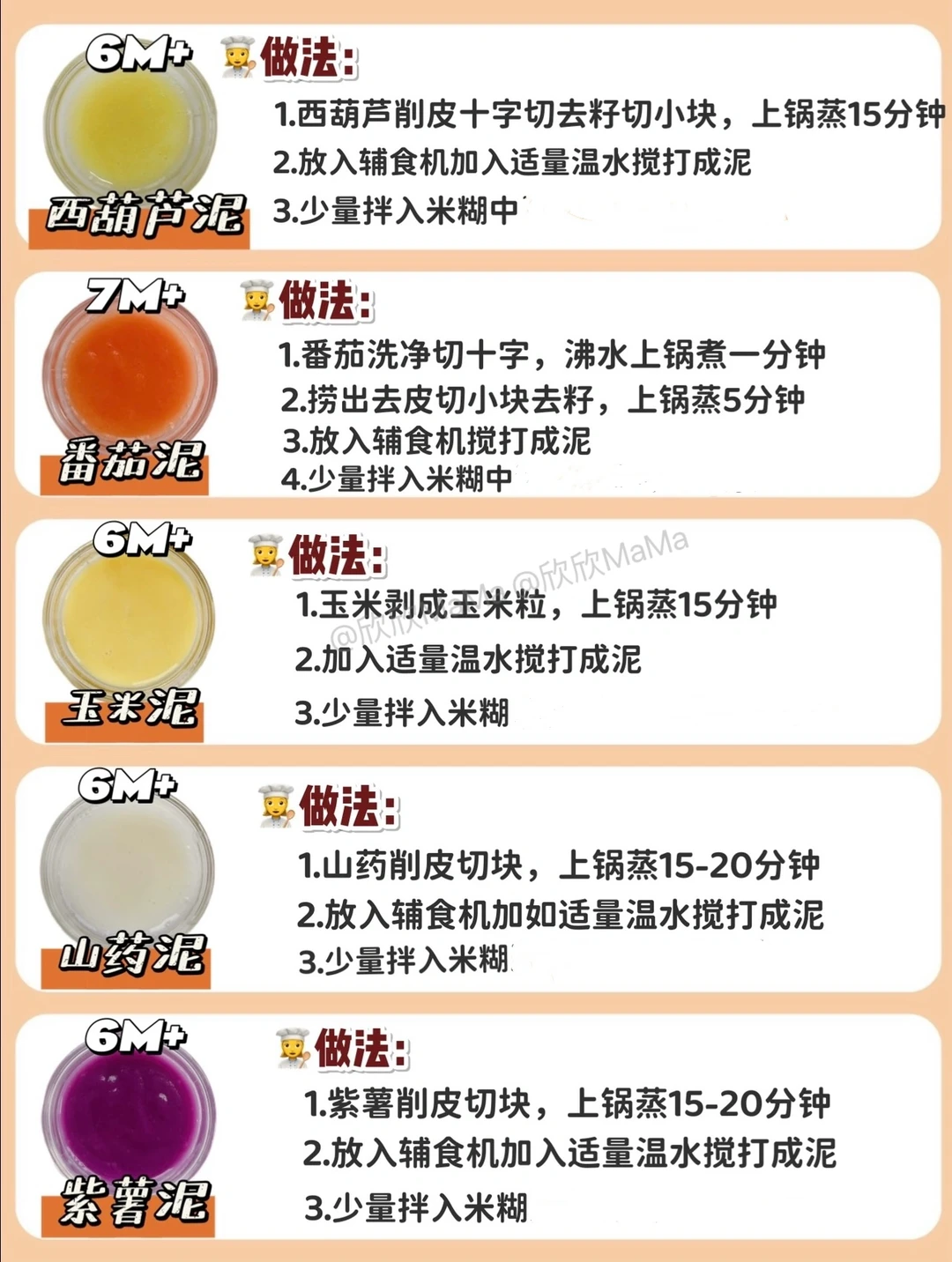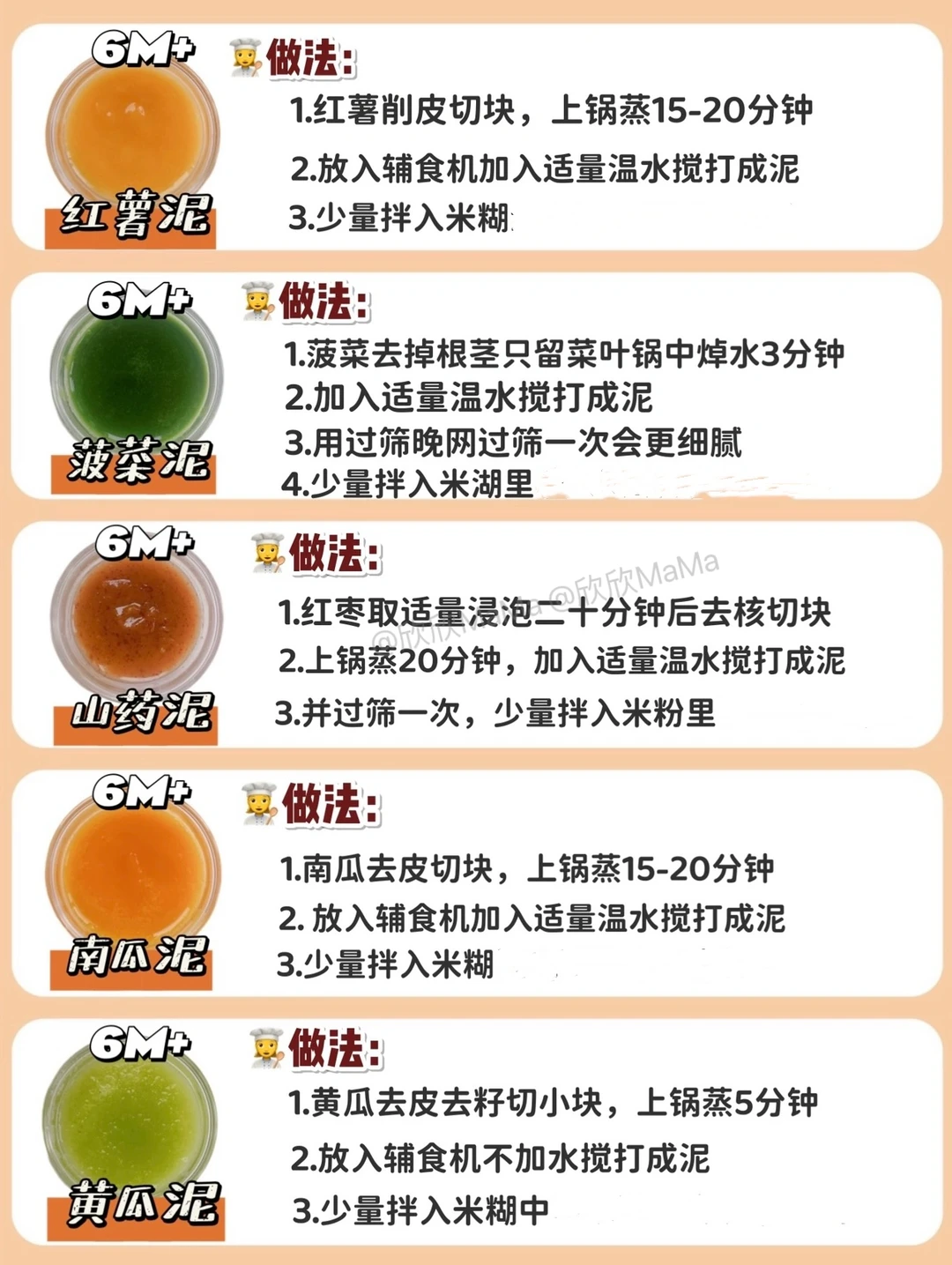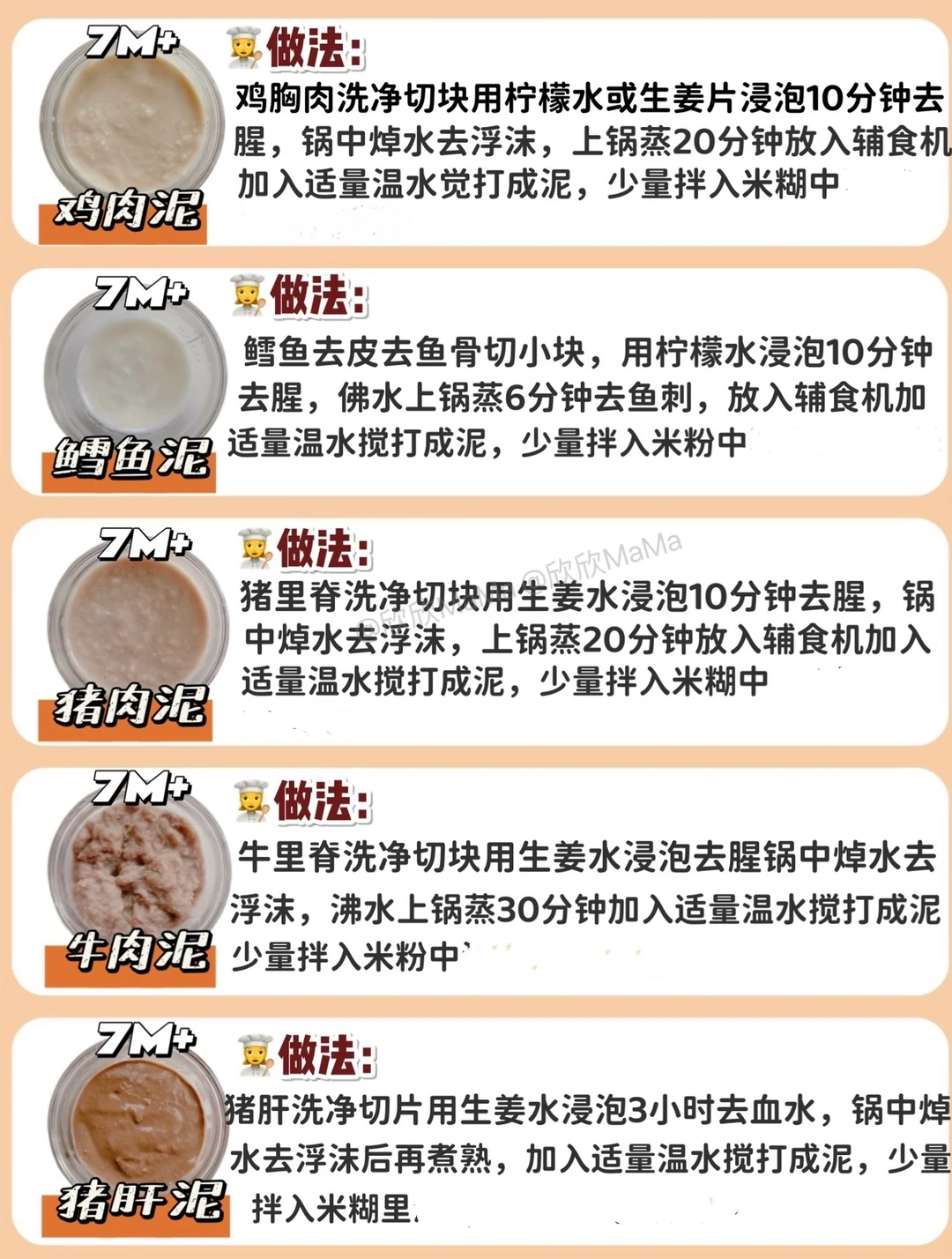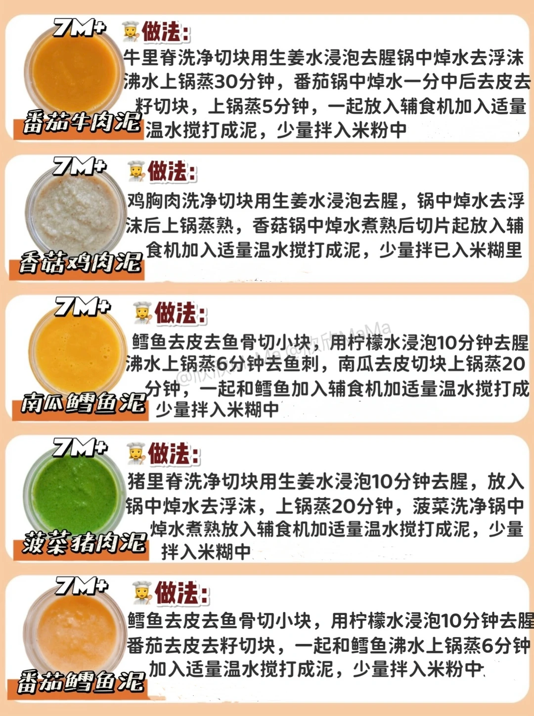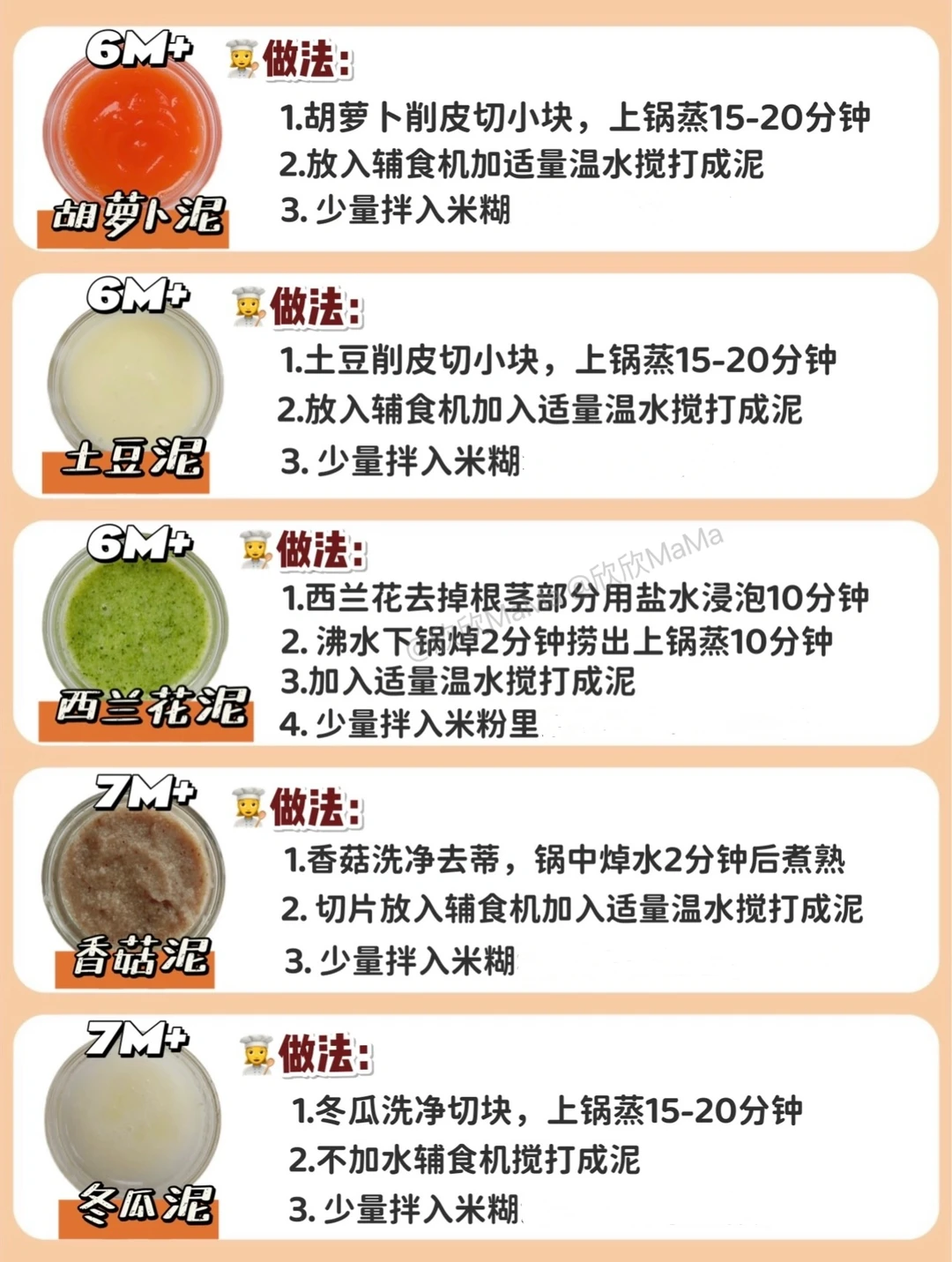 ⚠️ 每添加一种食材3天排敏期,如辅食泥第一天1-2勺,第2天2-3勺逐渐增加拌入米粉里滴入核桃油搅拌食用,水果泥单独吃!