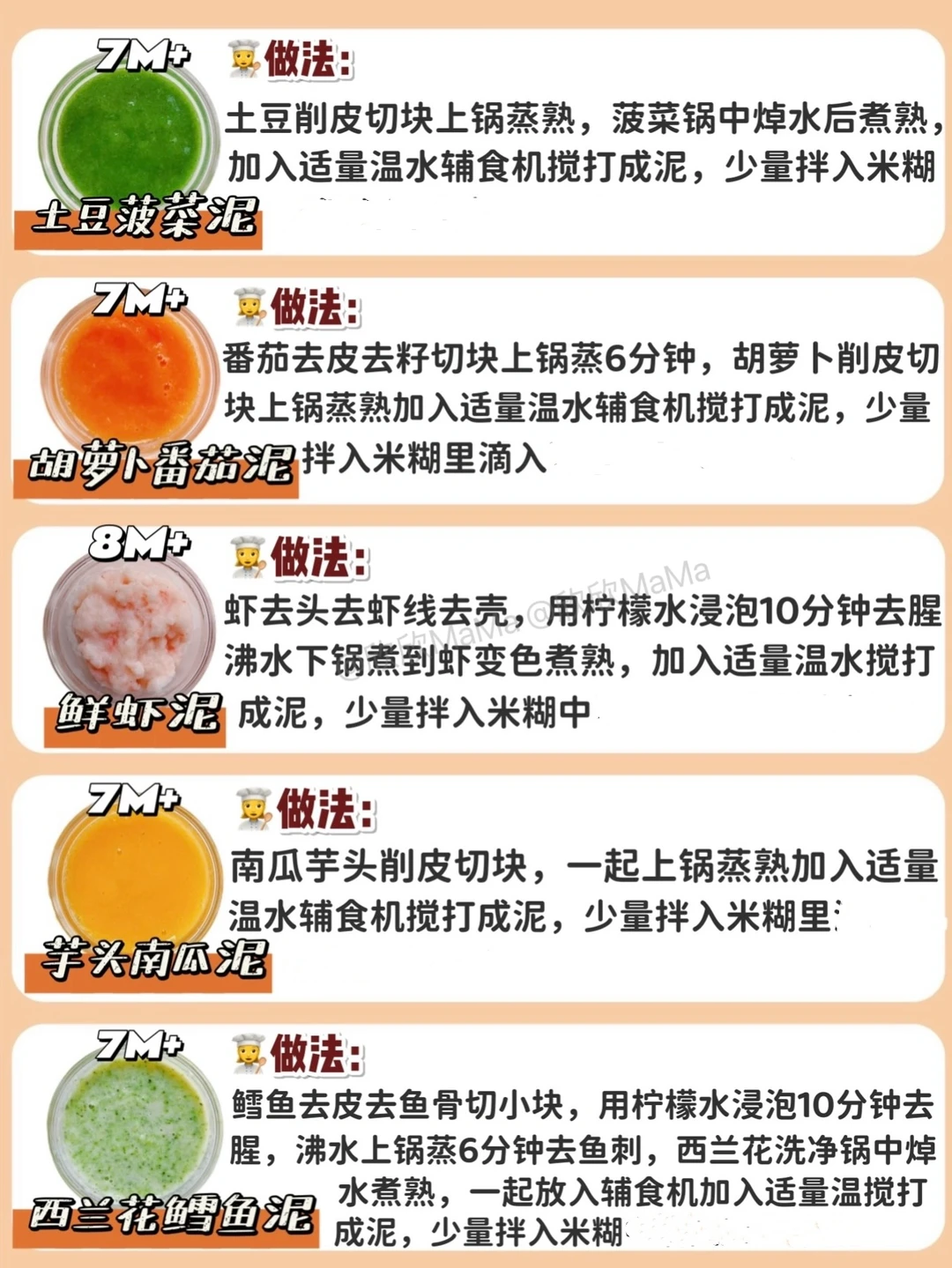 6月龄的宝宝就可以添加辅食了!但作为新手妈妈,辅食该怎么添加?6月龄应该吃什么?7月龄应该怎么吃?今天跟大家分享下30款常见辅食泥的做法,希望整理的对你们有用~