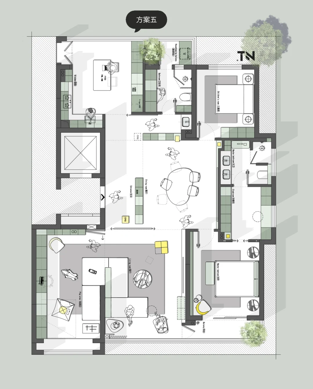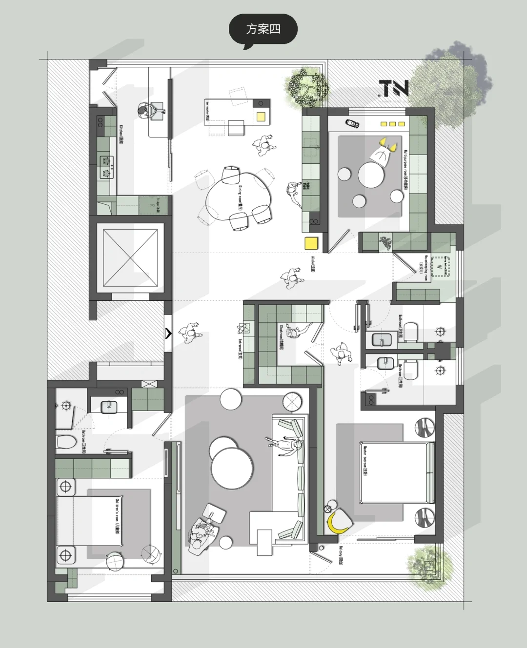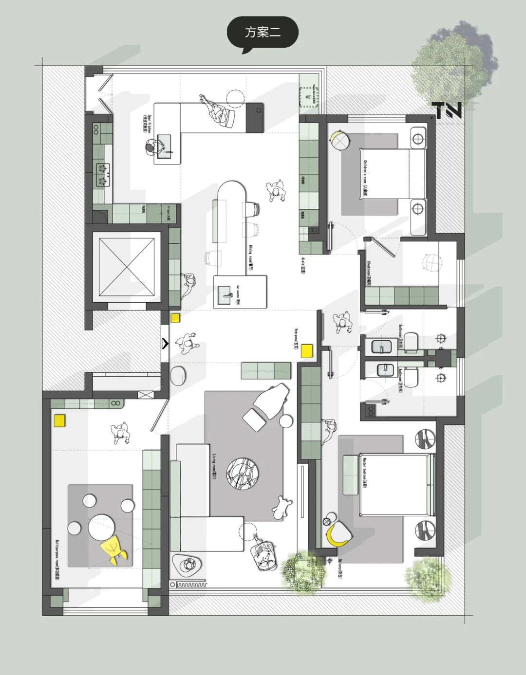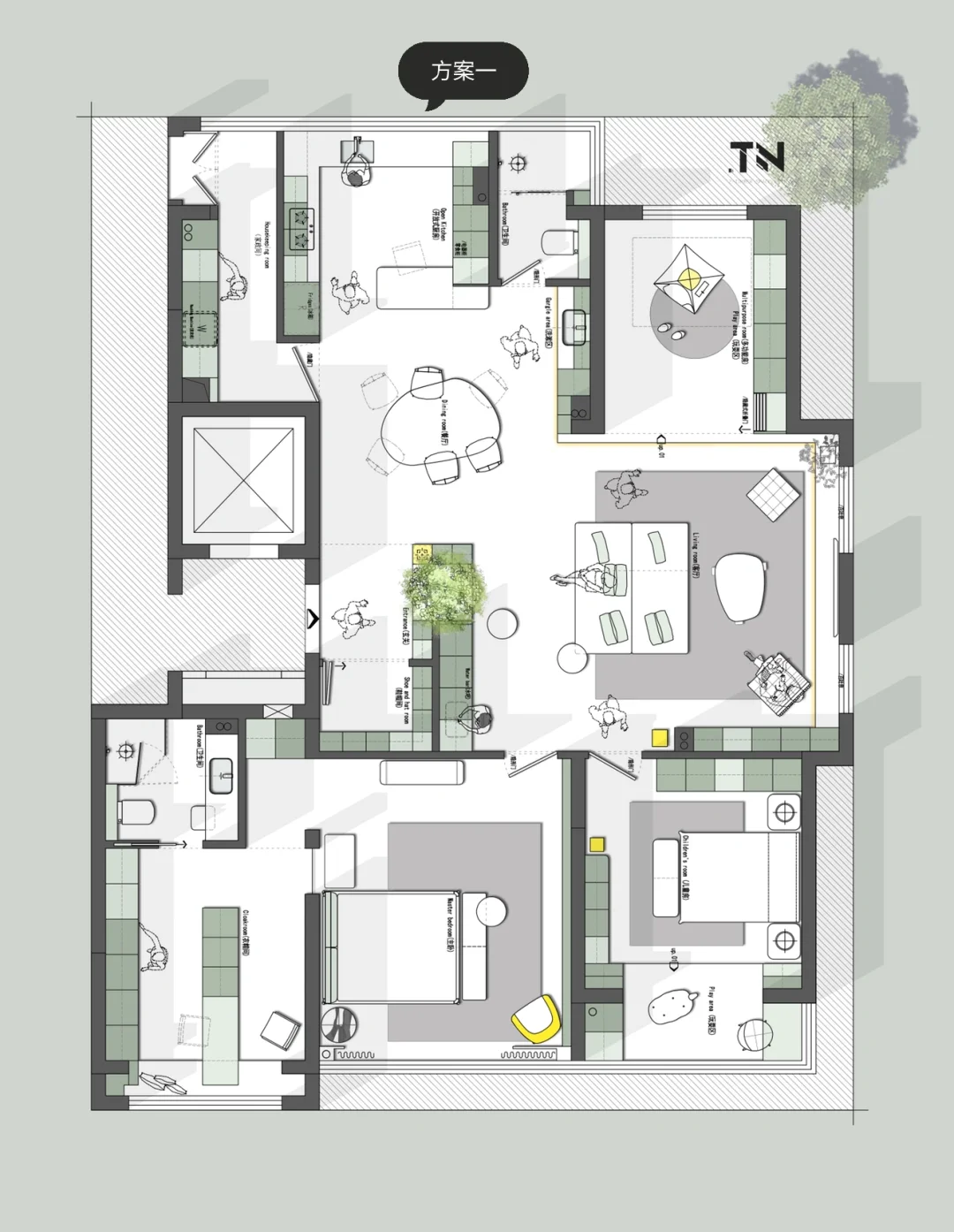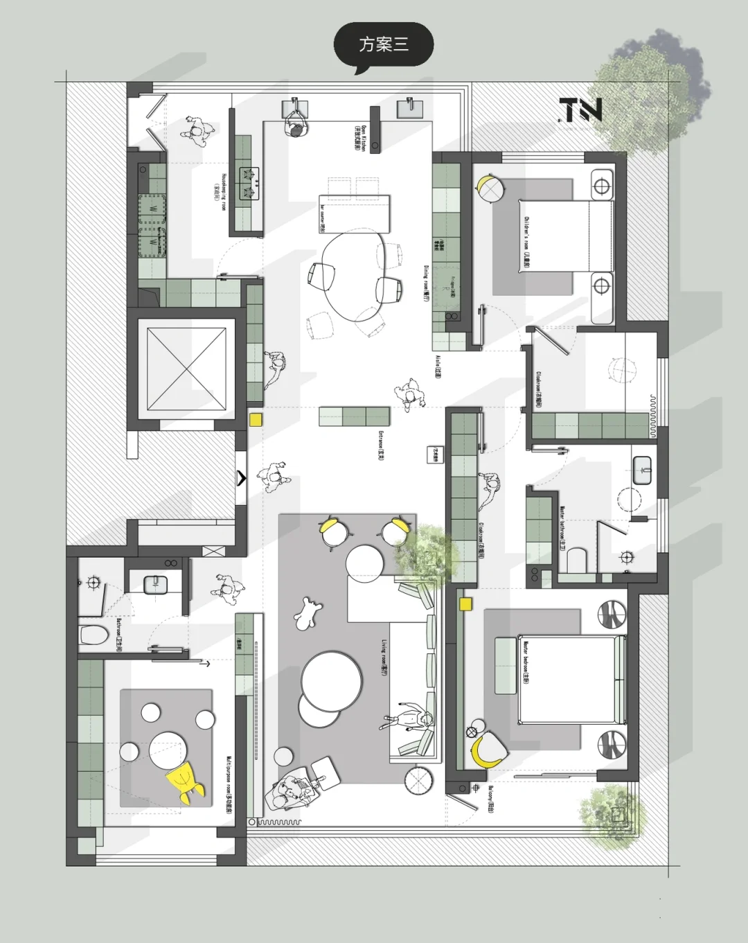 180平大户型,三口之家,如何优化? 欢迎来到评论区讨论 设计需求: 1、三口之家,一个主卧室一个小孩房,一个多功能房,偶尔老人也可以住,也可以是孩子的童玩区,不要榻榻米 2.厨房太小,喜欢厨房大,可开放,喜欢朋友来聚餐,希望餐厅可以容下十多人聚餐 3.客厅也要大一点,不喜欢沙发背后是入户门 4.鞋子衣服特别多,储物空间一定要多 5.需要一个独立的洗衣房,可以小一点,北面也可以 6.可以接受创意一点的方案