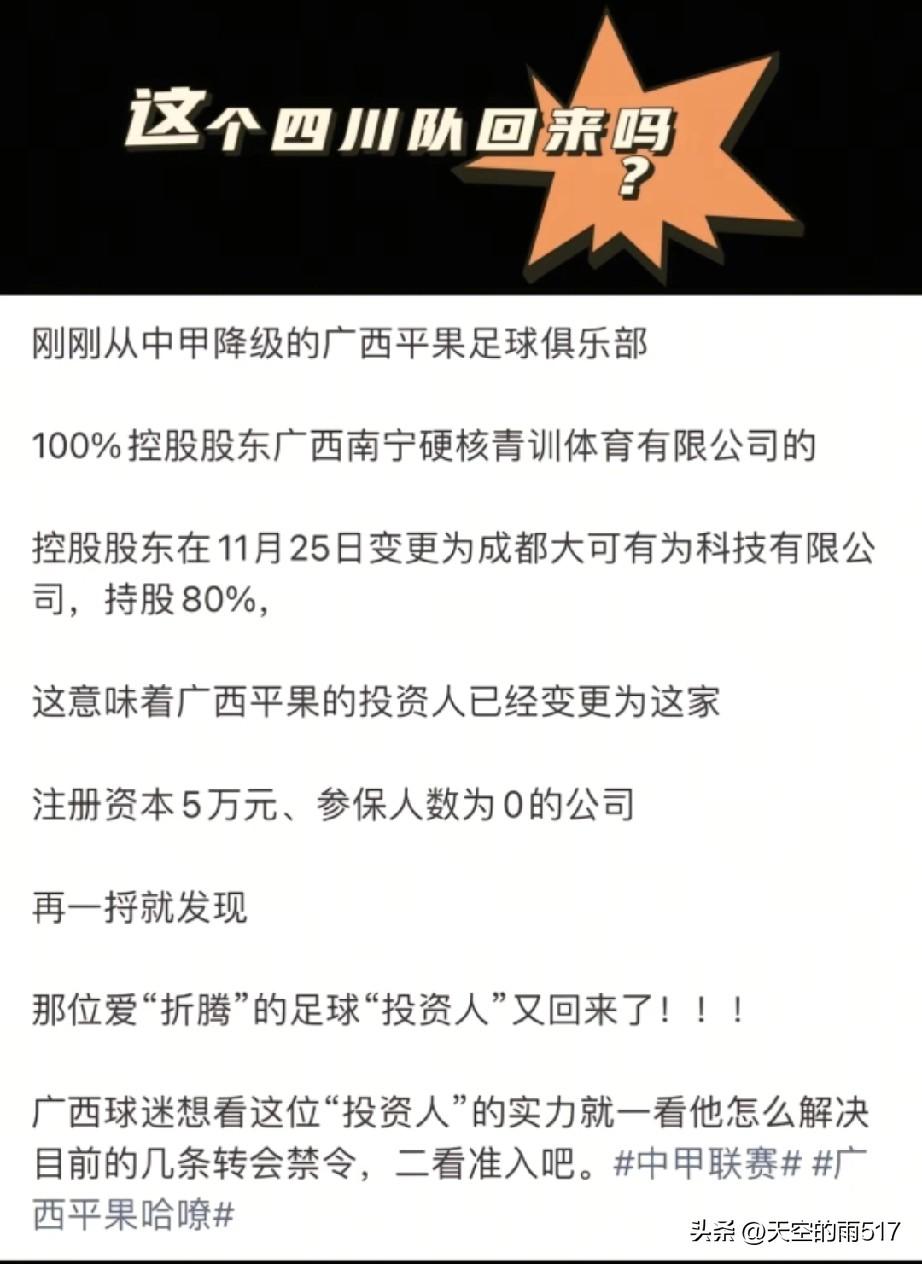 今天有消息透露,今年从中甲降入乙级广西苹果足球俱乐部股东悄悄发生了变更,最大股东已经成为成都大可有为科技有限公司。 那么这也就意味着广西苹果将要搬迁到成都,广西苹果足球队其实在中甲联赛后半段踢得也是相当顽强,如果搬迁到成都踢中乙联赛。广西苹果足球俱乐部,又将是一个消失在中国足坛的球队。