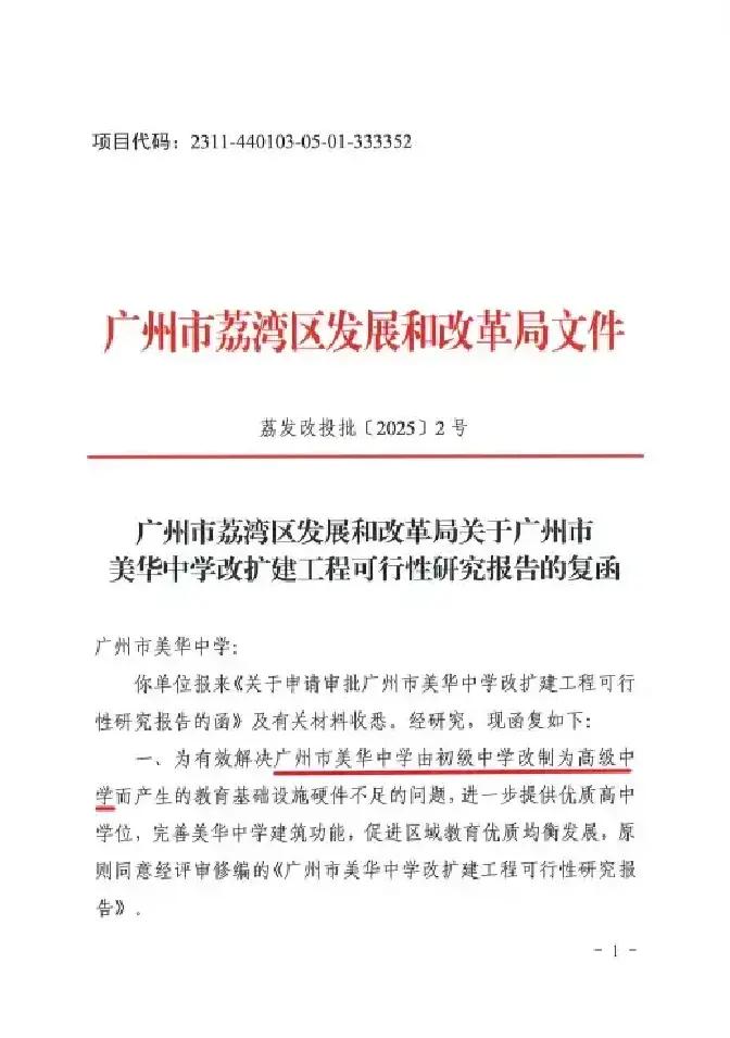 事情是这样:广州公共资源交易中心官网发布招标公告,里面写明,美华中学将从原来的初中改成高中学校,同时还要扩建一栋十三层的学生宿舍楼。能上马这么大的宿舍楼,基本可以判断,未来是按一所完整公办高中来规划的,而不是搞个小规模试点。