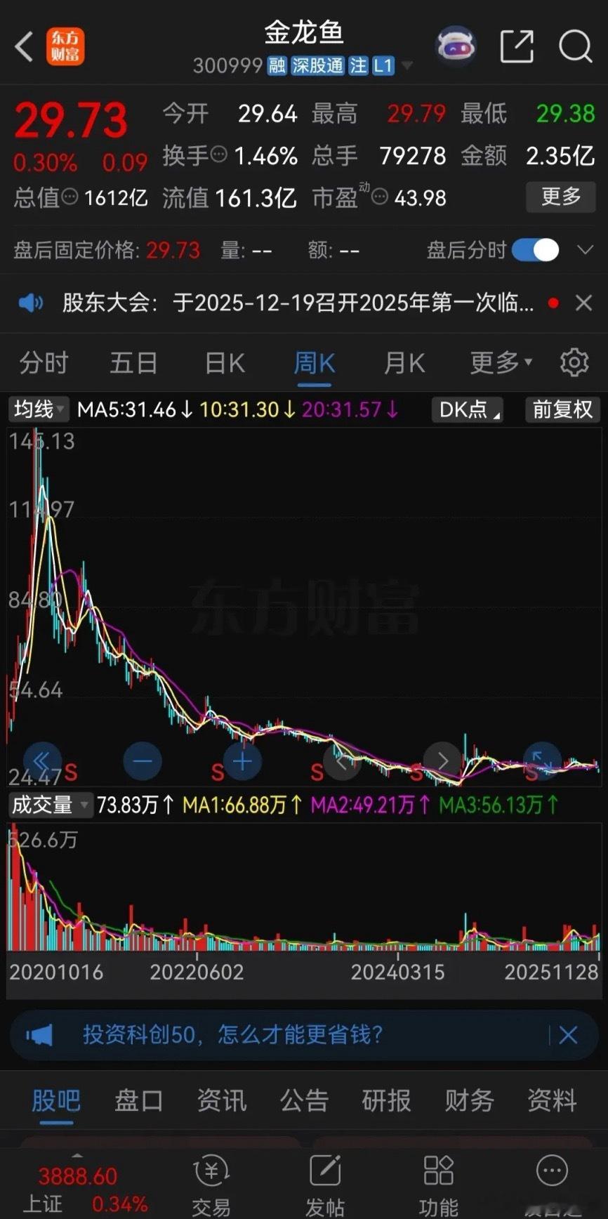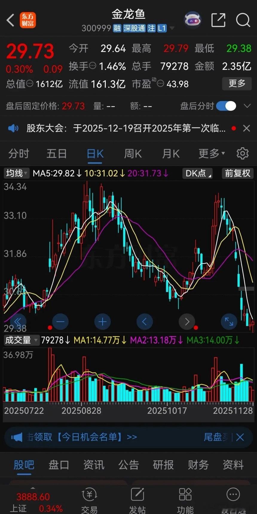 金龙鱼这是要跌成“鱼干”了吗?最近连续崩盘式下跌,10个交易日收出8根阴线,今天盘中最低跌到了29.38元,马上快到四月份关税贸易战的最低点了,这个价格已经跌到了3200点下方了,至少落后大盘800点,较去年十月份高点下跌了24%,今年进场的股民基本都被套牢了。2020年金龙鱼刚上市的时候被称为“油茅”,股价最高涨到了145元,连股神林园都非常看好,许多股民都做起了价值投资,准备长期持有。谁能想到四年时间股价腰斩了两三次,现在跌得一地鸡毛,长期持股的股民亏得鼻青脸肿,高位套牢的股民恐怕这辈子都很难解套了!