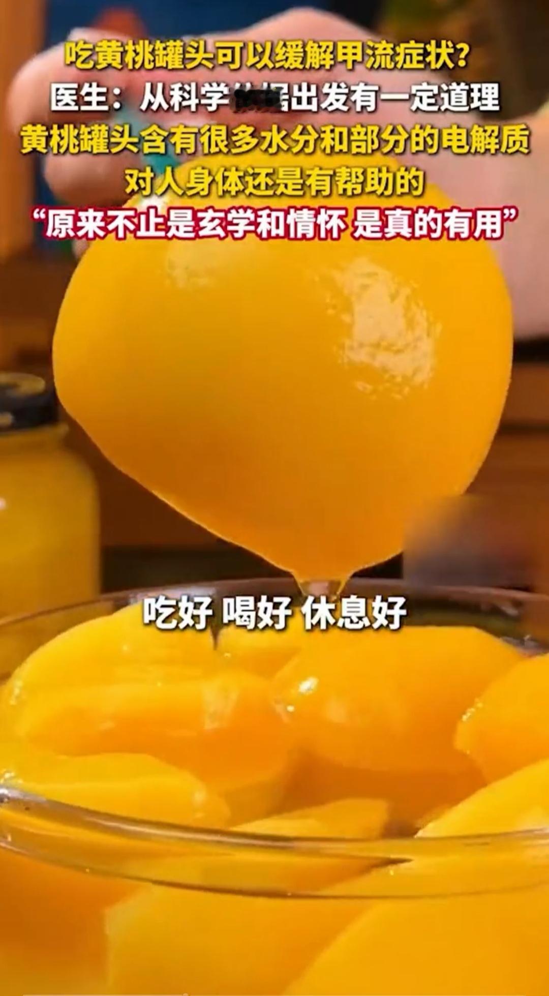 看来卖黄桃罐头的要备货了, 有没有做广告的嫌疑呀[捂脸] 只能说生病的人胃口不好不愿吃饭, 吃口黄桃罐头凉凉的舒服些。 被说成缓解甲流症状,真是把黄桃罐头神话了。