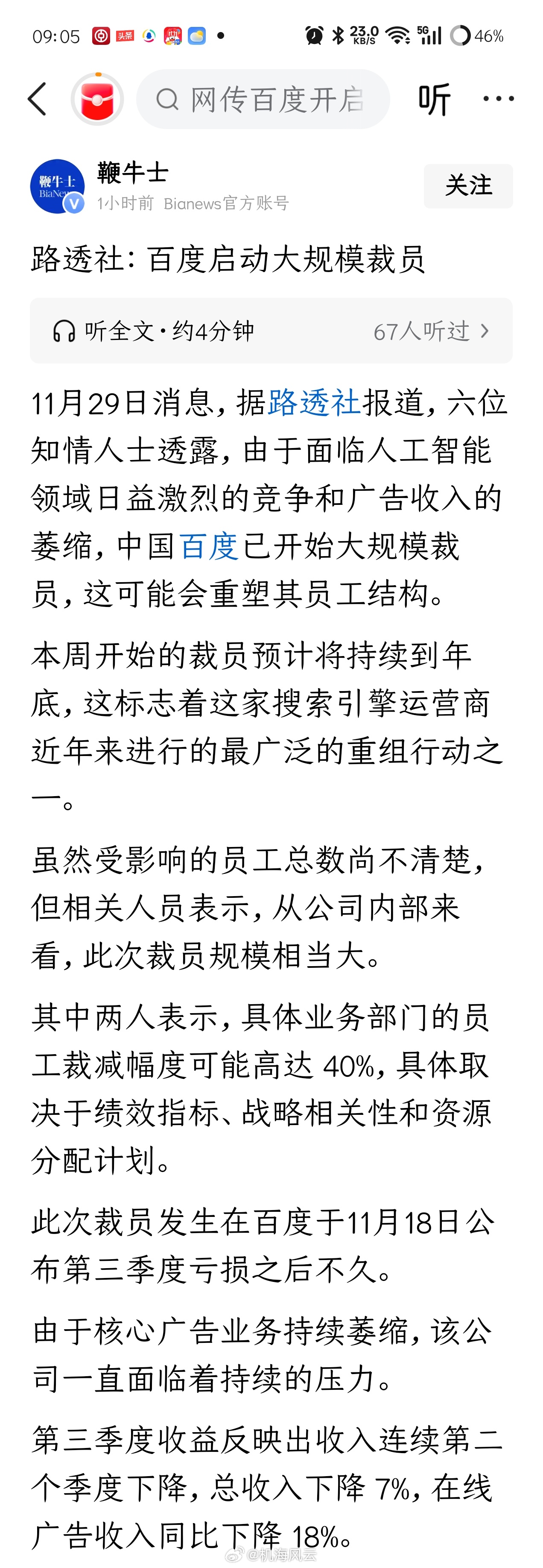 媒体援引路透社报道:百度启动大规模裁员