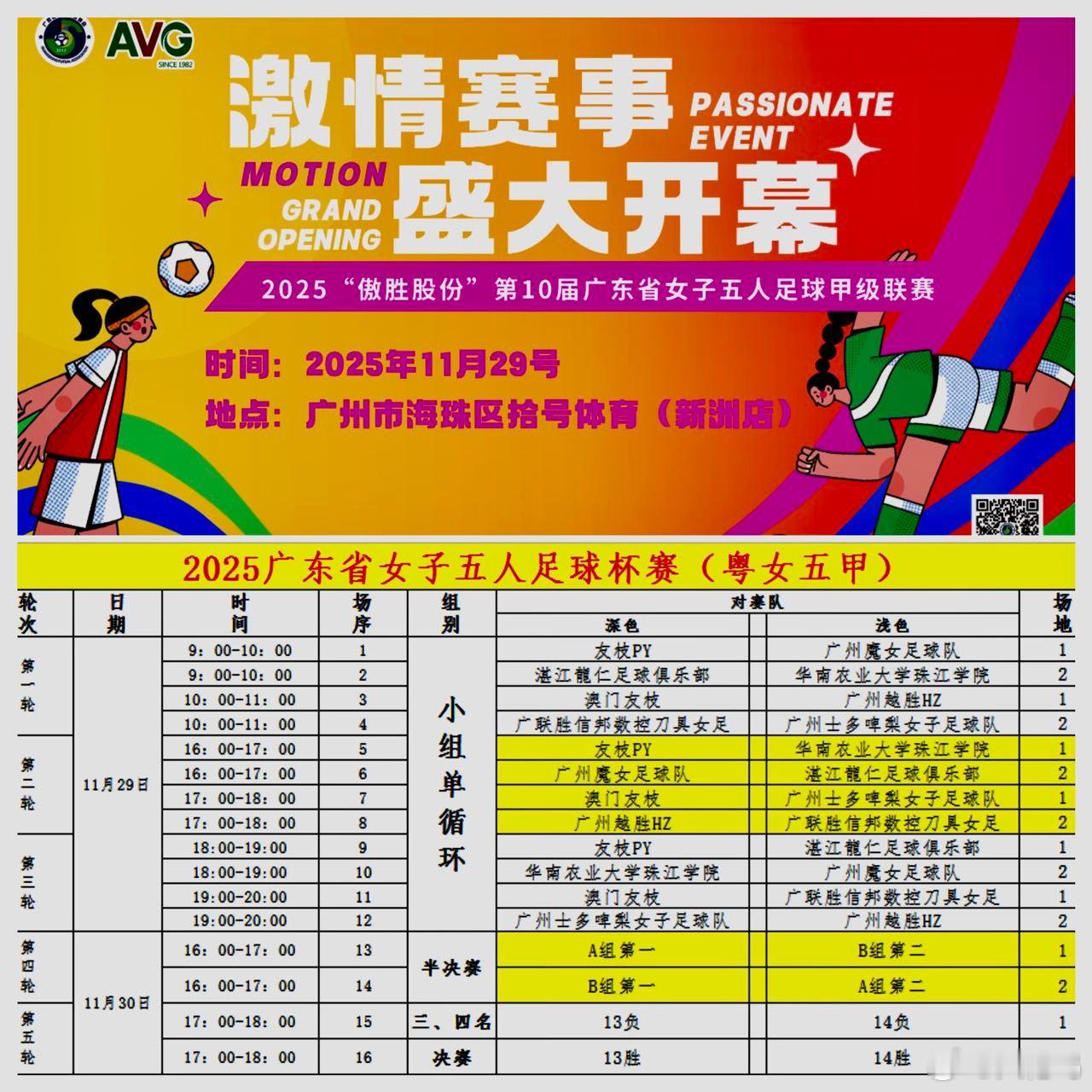 2025粤超系列赛事中的第3个比赛:“傲胜股份”第10届广东省女子五人足球赛(粤女五甲)马上开赛(今天11月29日上午9点)地点:广州海珠区拾号体育(新洲店) 本届赛事有来自全省乃至港澳台球员的8支代表队参赛……队员们说这是女子足球爱好者的嘉年华 已经10届了 带给了我们巨大乐趣! 赛事直播可用广东省五人足球协会视频号和广东省五人足球协会抖音号观看比赛、现场观看免费!鸣聊体育