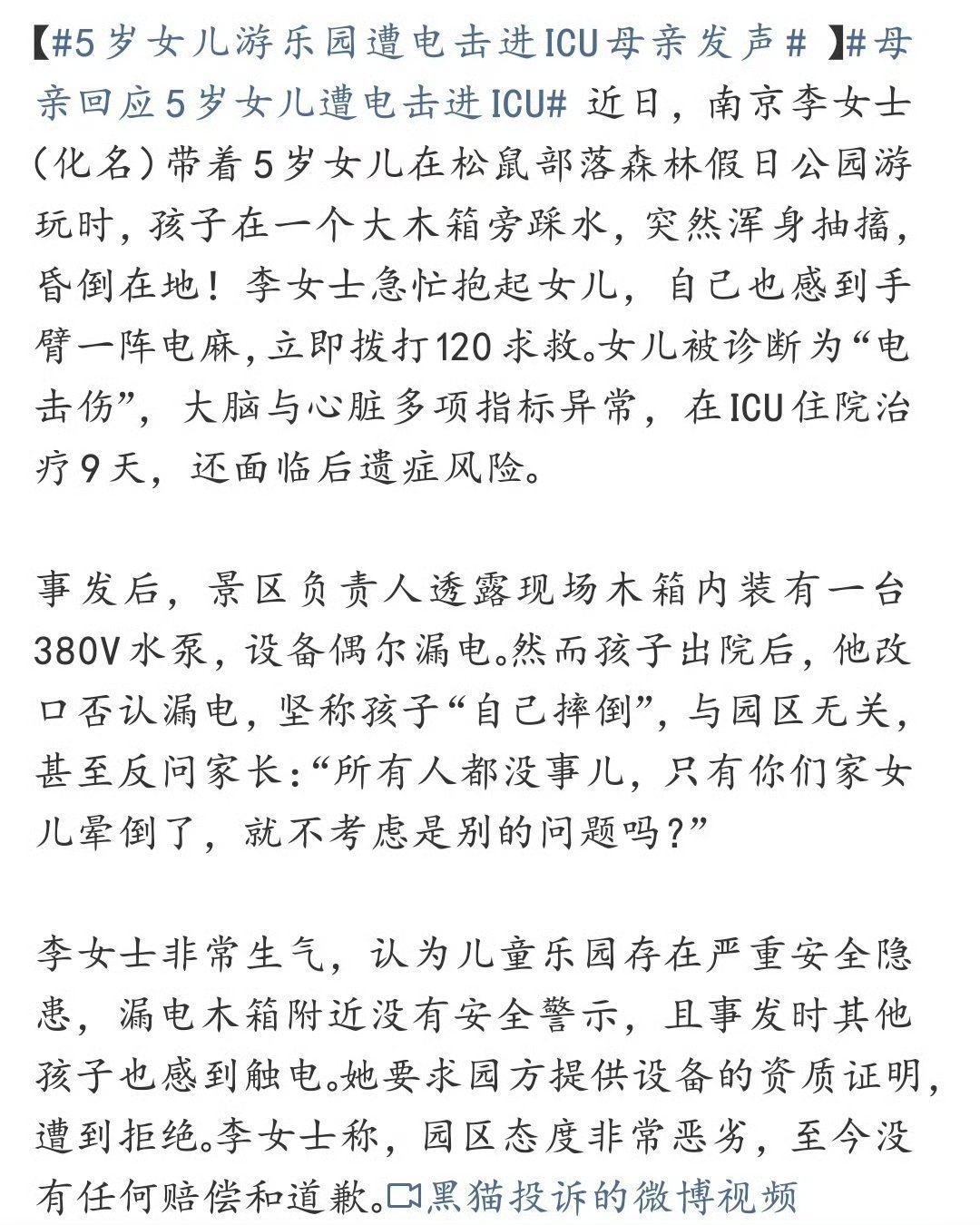 5岁女儿游乐园遭电击进ICU母亲发声 很多游乐设施是个人承包的,但公园也承担相应的连带赔偿责任。女童被游乐场的漏电设备击伤,医院诊断证明就是证据,可以告南京松鼠部落,让他们在内部分清赔偿责任。如果孩子造成了重大伤亡,相关人员还要承担刑事责任。如此有安全隐患的娱乐设施,为何能存在?