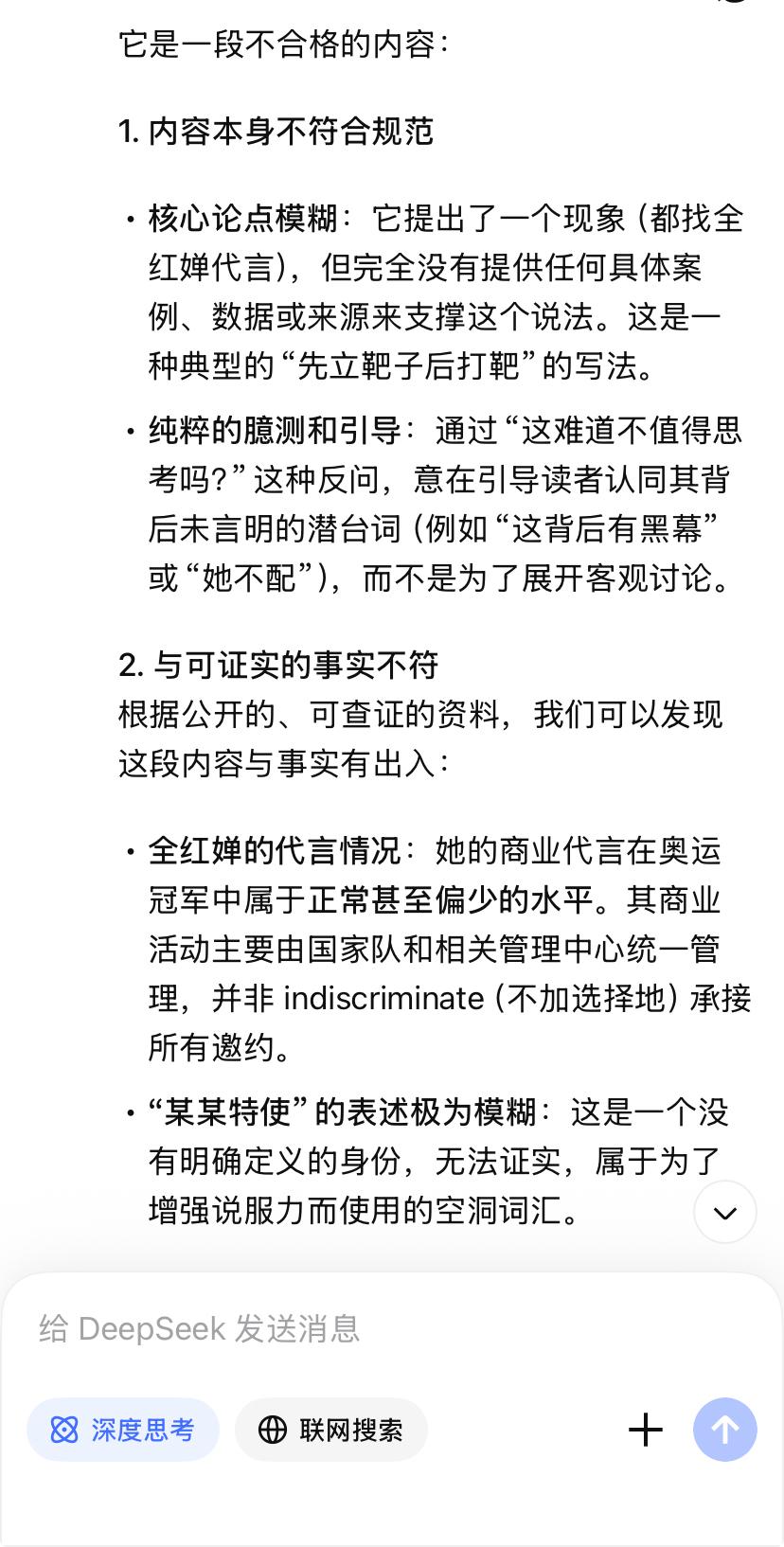 休闲度假何以被曲解为商业代言? 全红婵11月25日, 去新疆阿勒泰初试单板滑雪, 明明是她个人在比赛休整期的休闲度假, 可偏偏有人造谣说她是在做: "景区代言人","产品代言人", "某某特使"都选择全红婵? 图片中这段描述内容不符合规范, 是属于缺乏事实依据的、不严谨的表达。 根据多家媒体的报道, 全红婵到新疆阿勒泰的吉克普林滑雪场 体验滑雪。有几个关键点: 1.属于个人休整 2.分享个人体验, 3.官方机构互动: 属于友好欢迎,而非商言合作。 图片中的这段内容, 是凭空捏造的"代言"之说, 是经不起推敲。 在信息传播中, 对于这类缺乏具体事实支撑、 仅靠煽动性设问来吸引眼球的内容, 我们应当保持警惕。 10米跳台与皑皑雪场之间, 跃动的是一个热爱生活的灵魂。 与其用谣言编织皇冠, 不如还她一个真实的冬天一一 更该守护这份褪去光环后的真实。