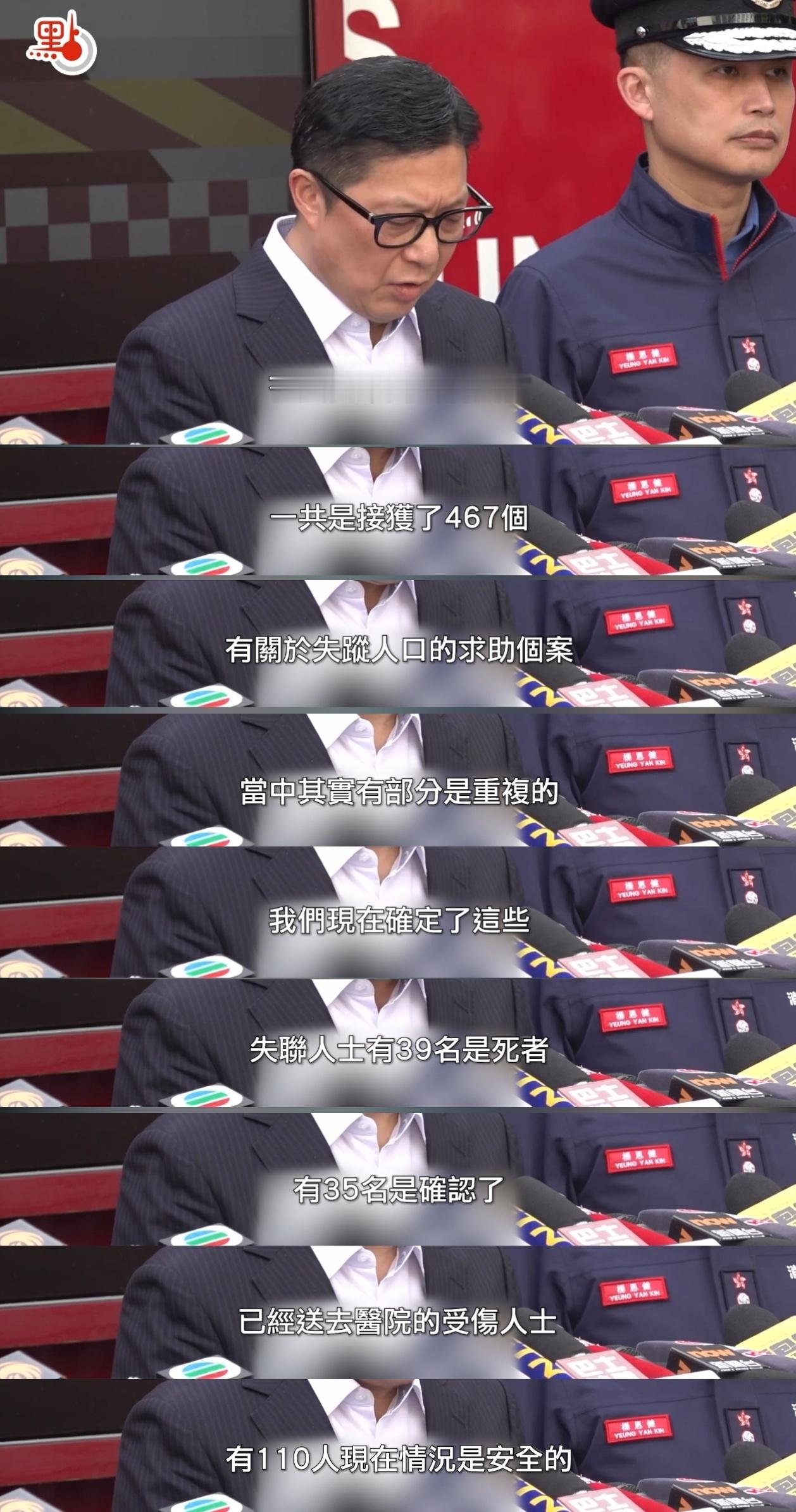11月28号,香港保安局局长邓炳强表示,大火期间,香港警方共接到467个失踪人口报案,其中有部分重复。已经确认其中39人死亡,35人受伤送医,110人确认安全。香港大埔火灾已致128人遇难香港大埔火灾约200人情况未明