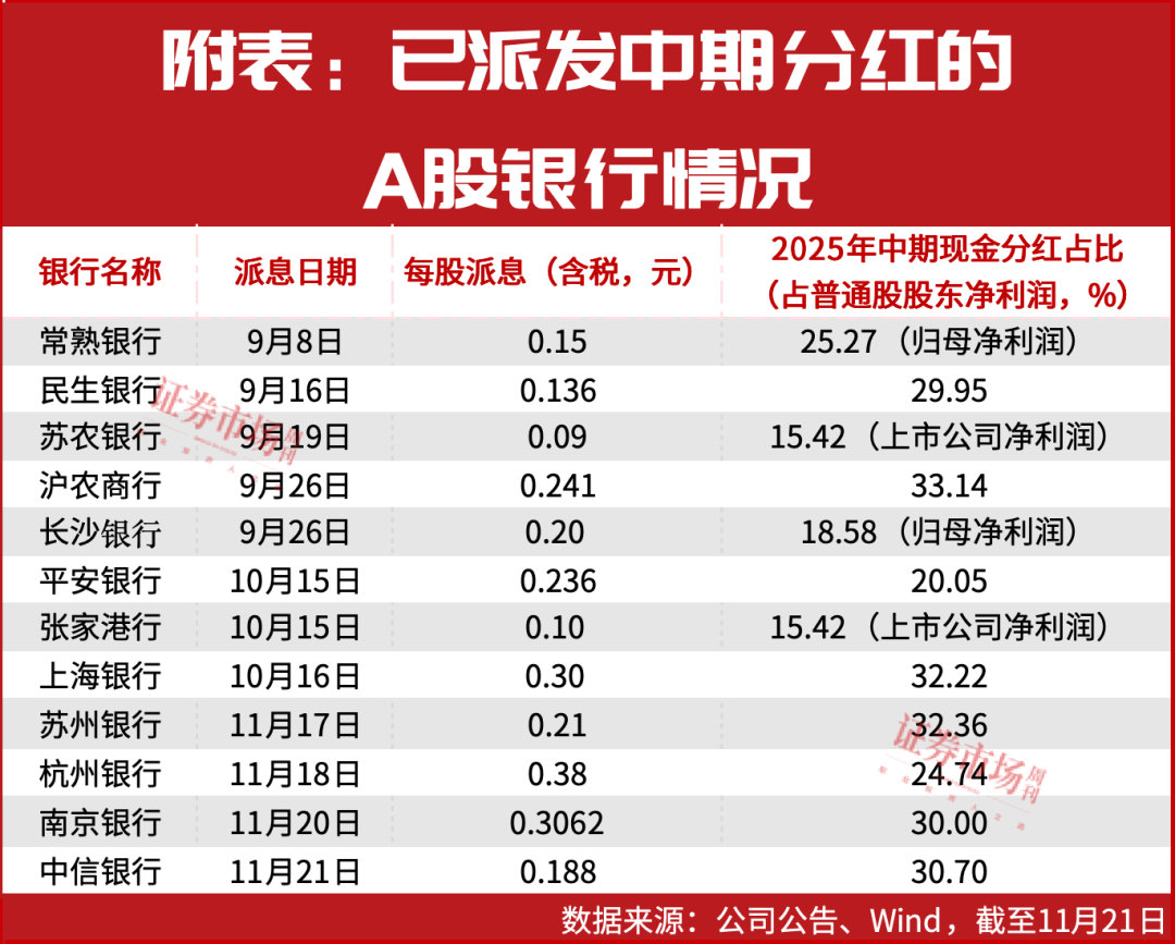 在已经派发中期分红的A股中小银行中,部分银行分红比例超过30%,部分城农商行也迎来了首次中期分红,预期全年分红金额将较2024年出现大幅提升。