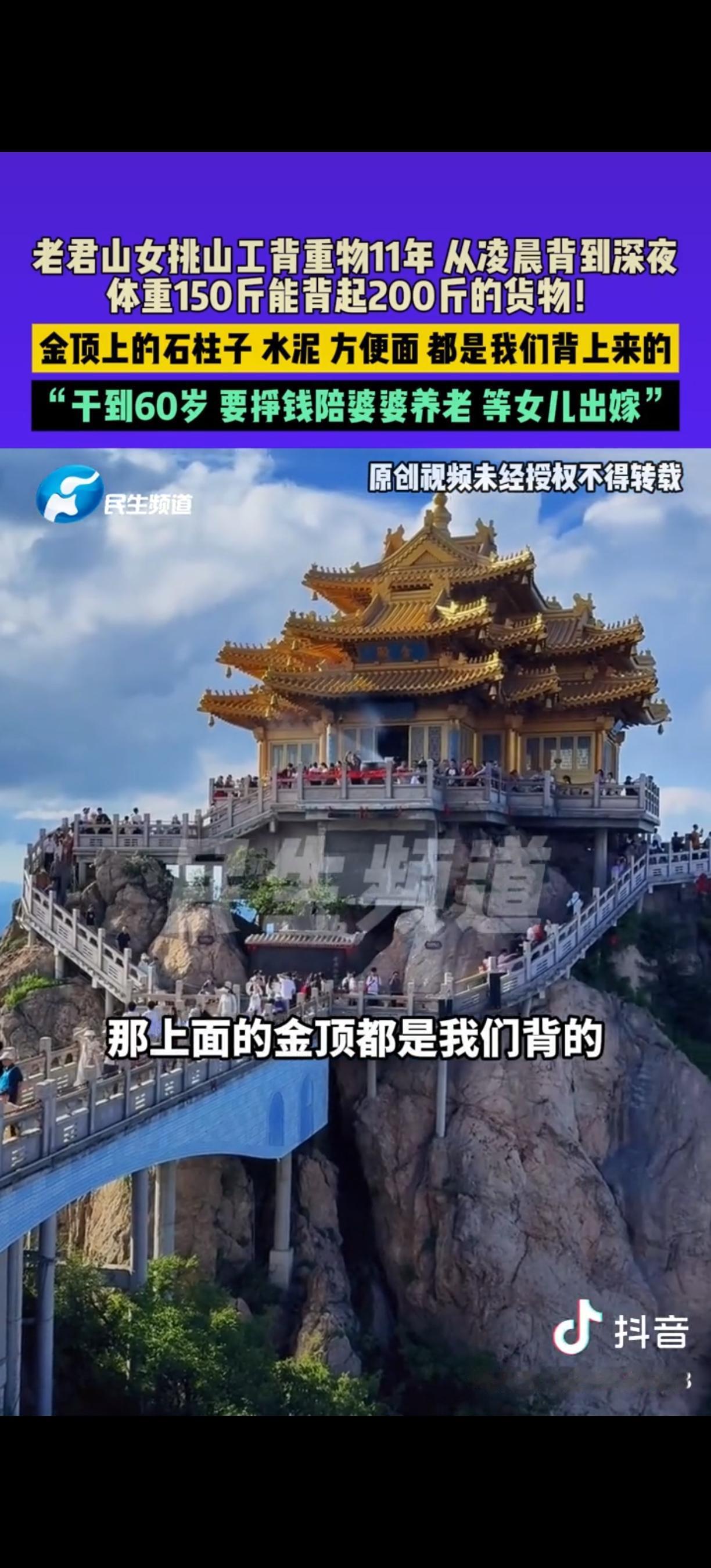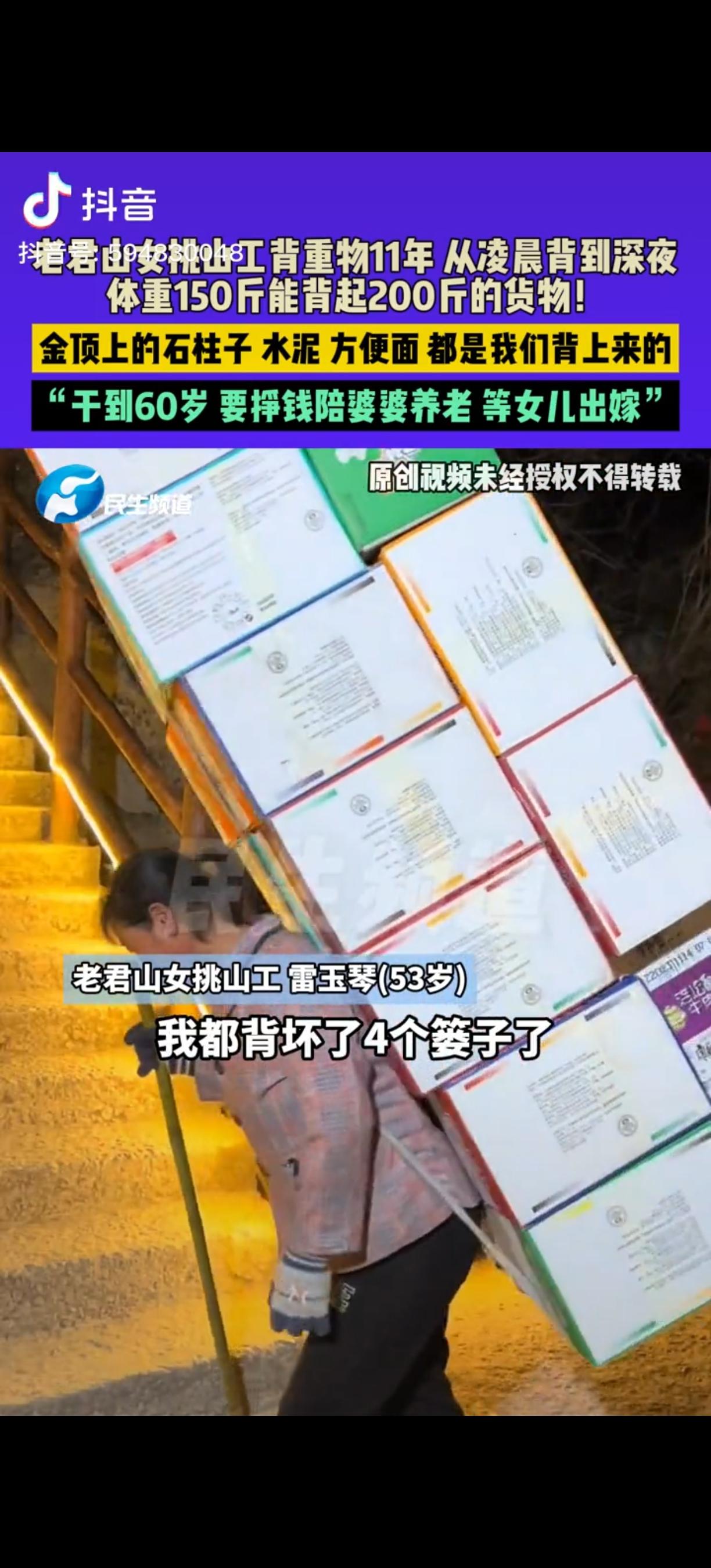 “让人心疼!”河南洛阳,女子在老君山当挑山工11年,每天背起200斤货物上山,记者问她干到什么时候,她说道:“我要干到60岁,女儿成了家,给婆婆攒几万块钱养老!”感动无数无数网友! 这位女挑山工叫雷玉琴,今年53岁。她体重150斤,却能背起200斤的货物,在老君山一干就是11年,背坏了4个篓子。老君山金顶上的石柱子、水泥、方便面,都是她和其他挑山工一步步背上去的。景区工作人员说,她一个人就能就能根几百斤的石柱子,特别能干。 雷玉琴不识字,她说自己没啥文化,挑山工虽然累,但挣的是辛苦钱,心里踏实。她每天从凌晨背到深夜,就为了给女儿攒嫁妆,给婆婆攒养老钱。 当记者问她打算干到什么时候,她笑着说,要干到60岁,等女儿成了家,再给婆婆攒个几万块钱养老,这样孙女要零花钱的时候,自己也能有点钱给她。 网友们知道她的故事后,都特别感动。有人说,雷玉琴用自己的肩膀扛起了一个家,是个了不起的女人;也有人说,希望她能早点完成心愿,好好歇歇。不管怎样,雷玉琴的这份坚持和担当,确实值得大家点赞。 各位读者你们怎么看?欢迎在评论区讨论。 来源:河南广播电视台民生频道 2025-11-28消息