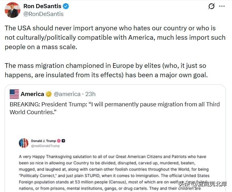 佛州州长RonDeSantis转发川普有关禁止第三世界国家移民的新闻。 “美国