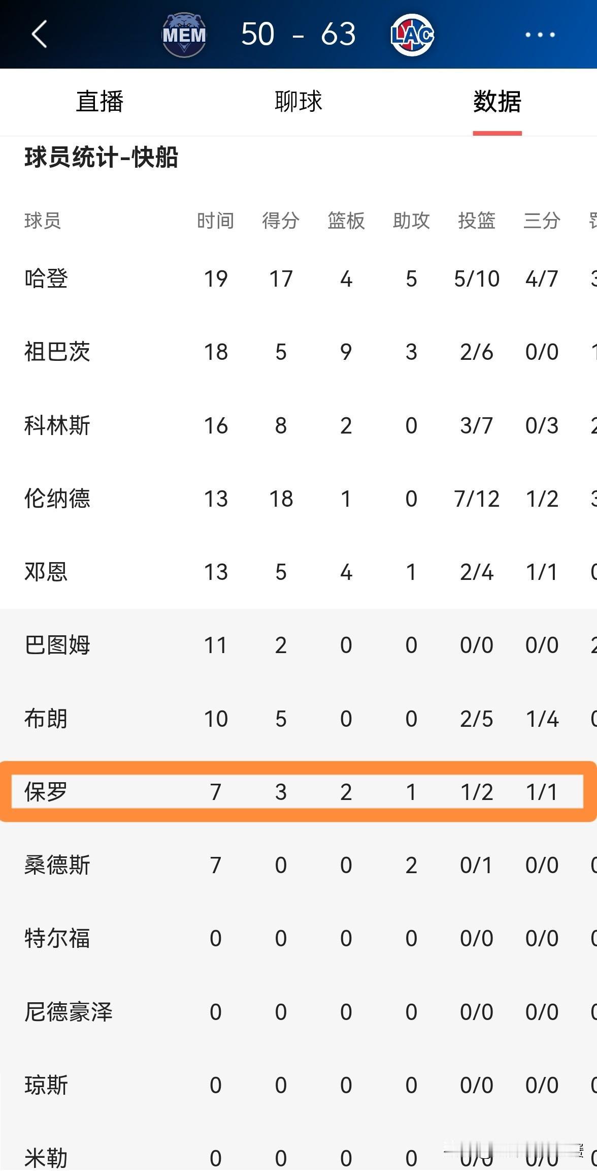 快船老将保罗终于不帮倒忙了!在今天快船主场迎战灰熊的比赛中,目前双方半场战罢,快船以63:50领先对手。在前两节比赛中,保罗替补出战7分钟,三分球1中1得到3分2篮板1助攻0失误,他的场上正负值为+4。 谢天谢地,今天保罗的场上正负值终于是正数了,这说明他在场上没有给球队帮倒忙。