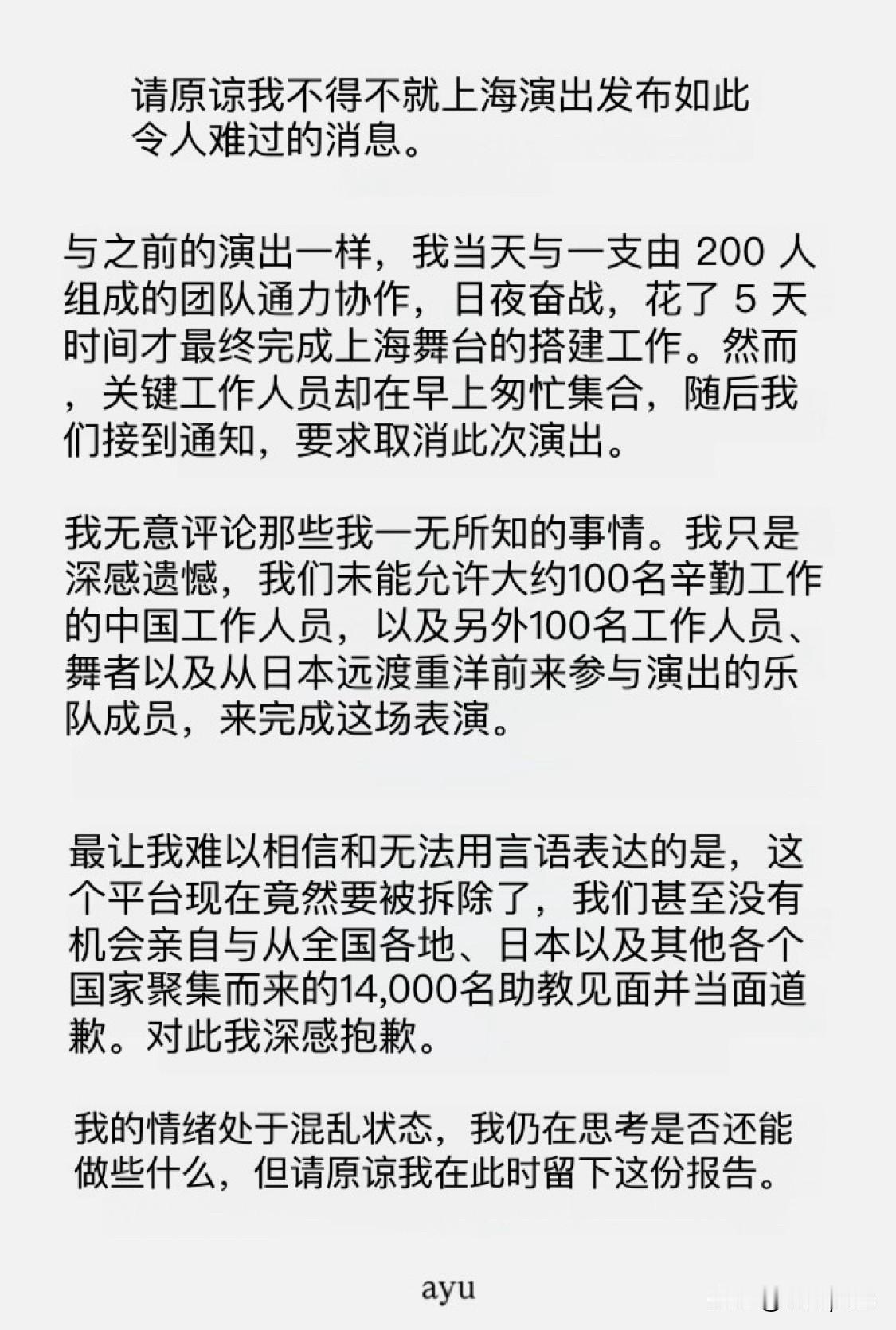 滨崎步的上海演唱会取消,滨崎步向1.4万歌迷道歉,并向200名工作人员表示遗憾。滨崎步与200名工作人员花5天时间搭建了舞台,滨崎步说最让她难以相信和无法用语言形容的是舞台要被拆掉了。 滨崎步表示她的情绪处于混乱状态,并向全国各地、日本、外国来的1.4万歌迷表示道歉。 此前,滨崎步在杭州、北京举行了演唱会。这是她亚洲巡回演唱会的一部分。滨崎步此次巡演包括杭州、北京、上海、香港、台北等中国城市。 按照滨崎步的说法,在上海的演唱会卖出了1.4万张票。此前网站信息显示,滨崎步上海演唱会门票票面价格是680元至2580元。估计门票就卖了1000万至2000万元。此外,歌迷的住宿、交通、饮食、旅游等也受到影响。
