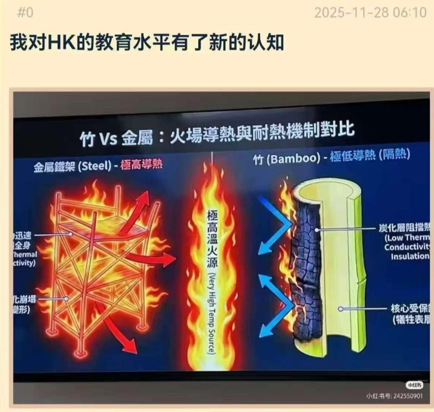 火灾视频传到内地时,不少人第一反应是“震惊”——都2025年了,高楼翻新居然还在用竹子当脚手架?