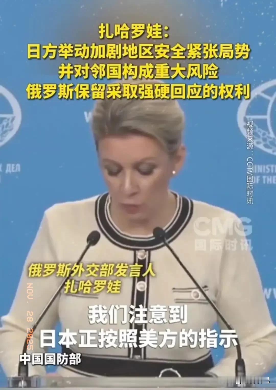 东方大国有事,就是俄罗斯有事! 11月27日,俄罗斯外交部发言人扎哈罗娃第二次为力挺中国发声,这次已经不是批评和谴责,而是赤裸裸的威胁。 最近日本在亚太地区的动作那是越来越多,越来越出格,简直就是在危险的边缘疯狂试探。 这不,俄罗斯外看不下去了,直接霸气发声:“中国若有事,就是俄罗斯有事!”这话一出,那可是给日本敲响了警钟! 扎哈罗娃明确警告日本,你们这些举动正在加剧地区的安全紧张局势,给邻国带来了巨大的风险。俄罗斯可不是在旁边看热闹的,我们保留对日本采取强硬回应的权利!这话里的潜台词再清楚不过了,要是日本敢对中国动歪心思、搞侵略,俄罗斯绝对会毫不犹豫地出手。 为啥俄罗斯会这么坚定地支持中国呢?这可不是没有原因的。日本最近几年在军事扩张的道路上越走越远,不断增加军费开支,突破“专守防卫”原则,还在西南诸岛大量部署进攻性武器。这些岛屿距离咱们中国台湾地区非常近,日本的意图那可是司马昭之心,路人皆知。而且,日本还不老实,频频在台湾问题上发表错误言论,公然违背一个中国原则,这不仅是中国不能容忍的,俄罗斯也看在眼里,记在心里。 再看看俄罗斯这次的表态,那可不是空穴来风。就在11月27日的记者会上,扎哈罗娃直接点名日本在冲绳地区部署进攻性武器,说这是“按照美国指示将领土军事化”。她还翻出历史旧账,说80年前这些岛屿上的血腥冲突,就是因为日本统治者的错误选择,而现在的日本政府“再次走上侵略性军国主义道路”。这话就像一把手术刀,直接剖开了日本战后政治最敏感的神经。 不仅如此,俄罗斯还用实际行动来支持自己的表态。俄军在南千岛群岛进行军事演习,展示在日俄争议领土上的军事设施,这意味着日俄争议领土已经成为了一个战略支点。而咱们中国呢,解放军在台海及周边常态化战备巡航,死死盯着西南方向的海空态势,用实际行动回怼日本的挑衅。中俄两国这一默契的配合,简直就是给日本划下了一条清晰的红线,越界必遭反制! 日本可能还以为自己抱着美国的大腿就可以为所欲为,但是它忘了,中俄两国现在已经紧密地站在一起。俄罗斯的图-95战略轰炸机在日本海巡航,中国的万吨驱逐舰穿关键海峡,中俄的军事力量可不是吃素的。要是日本真的敢轻举妄动,那可就不是吃不了兜着走那么简单了。 有网友说得好:“日本这是好了伤疤忘了疼,当年的教训还不够深刻吗?”确实,历史的教训就在那里,日本应该好好吸取,而不是一错再错。我们希望日本能够认清形势,停止一切挑衅行为,否则,中俄两国的强硬反制,可不是它能承受得起的。 大家对于这件事是怎么看的呢?是不是也觉得日本应该赶紧悬崖勒马,不要再执迷不悟了?欢迎在评论区留言讨论,一起说说你们的看法!