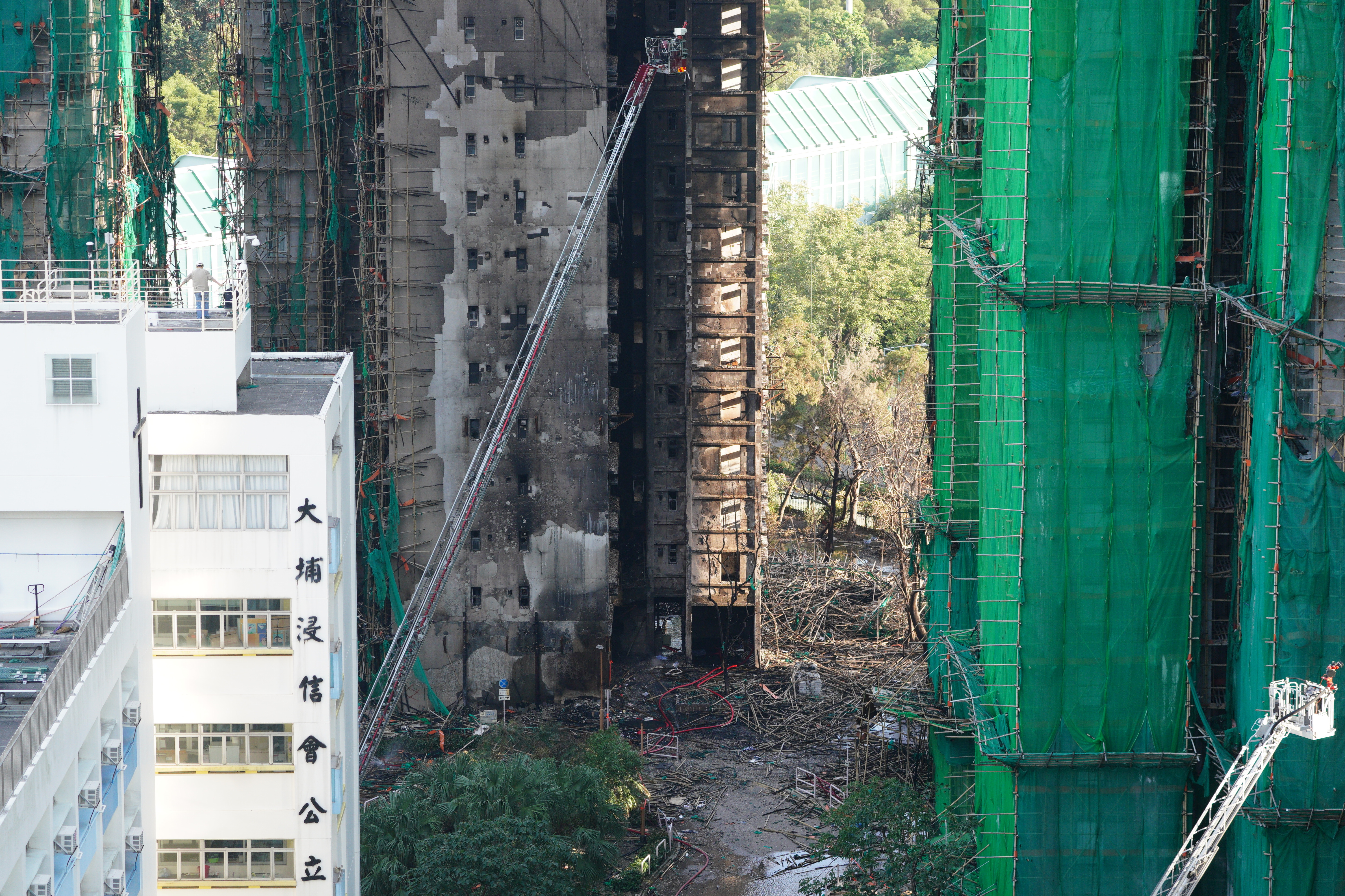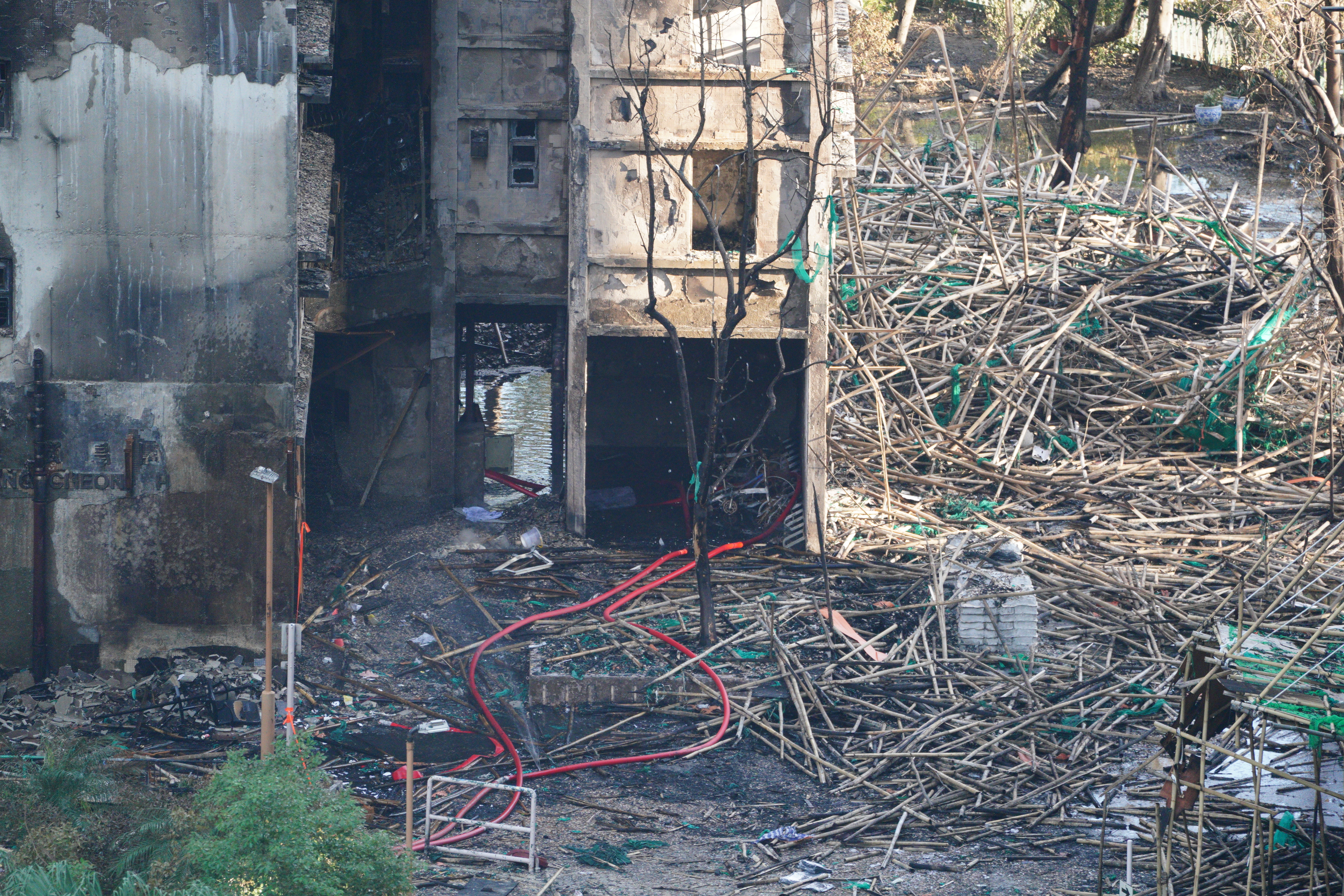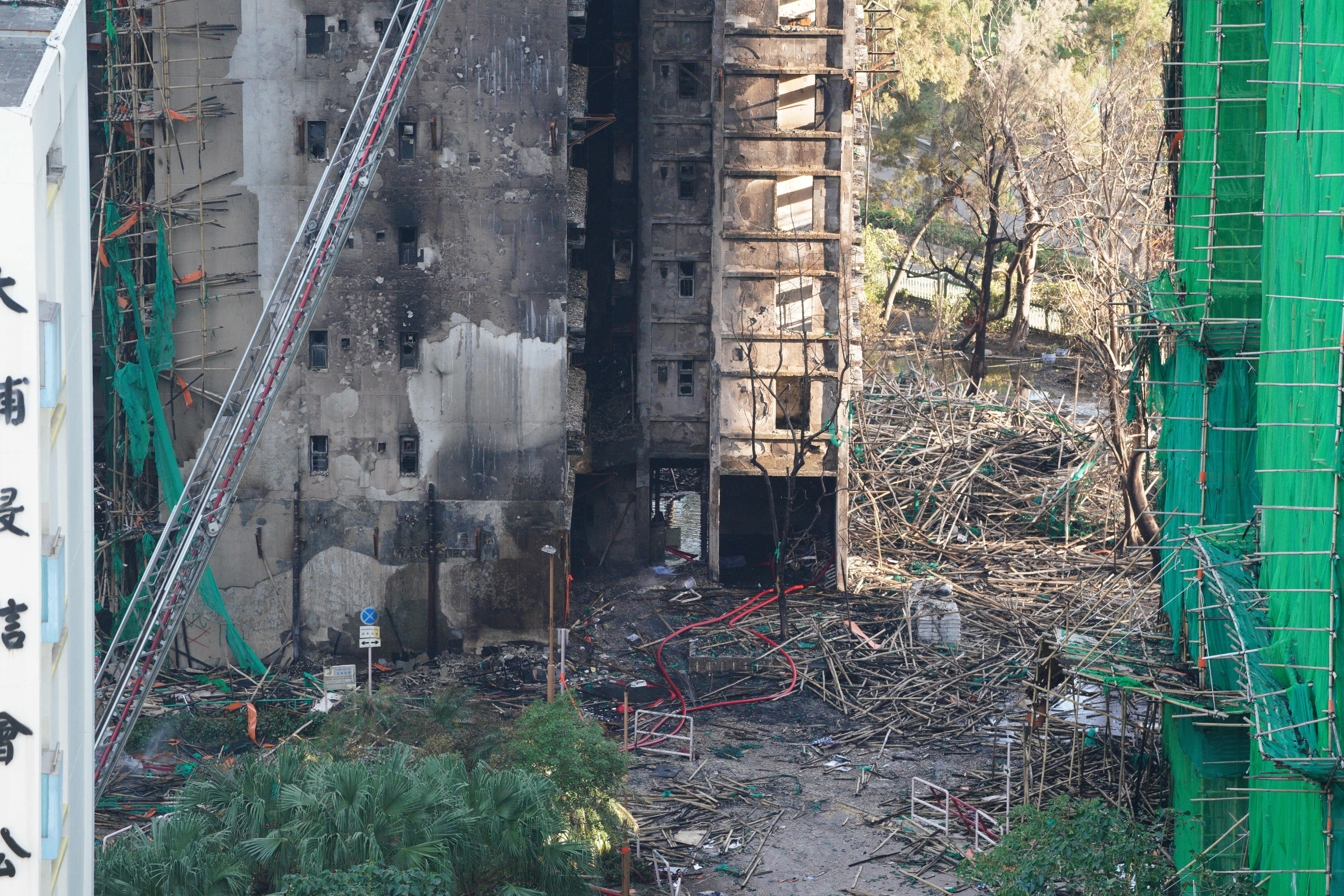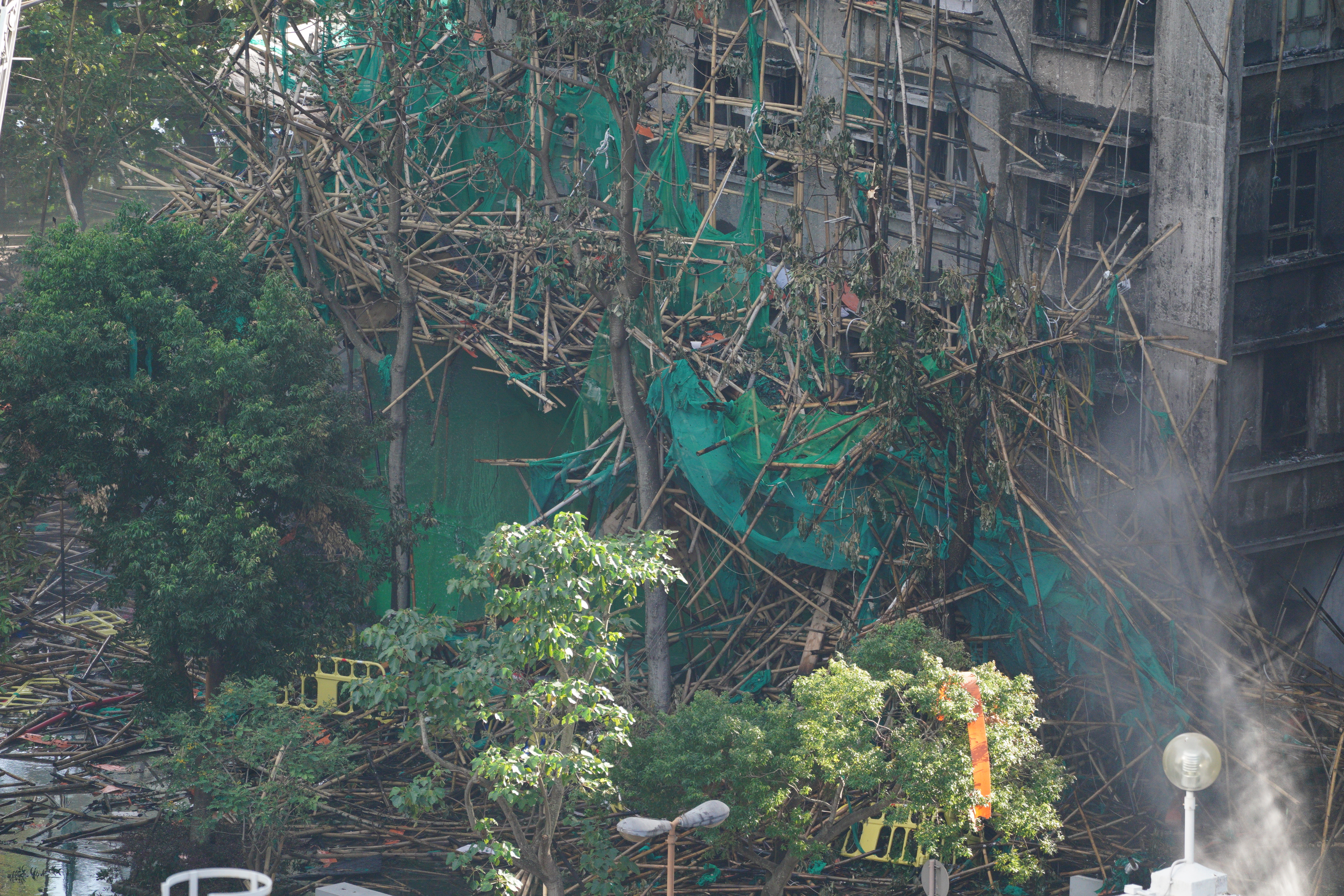 大公文汇网发布的大火熄灭后的画面,不少掉落的竹棚堆积在楼下,甚至堵住了出入口。热点现场香港大埔火灾已致128人遇难