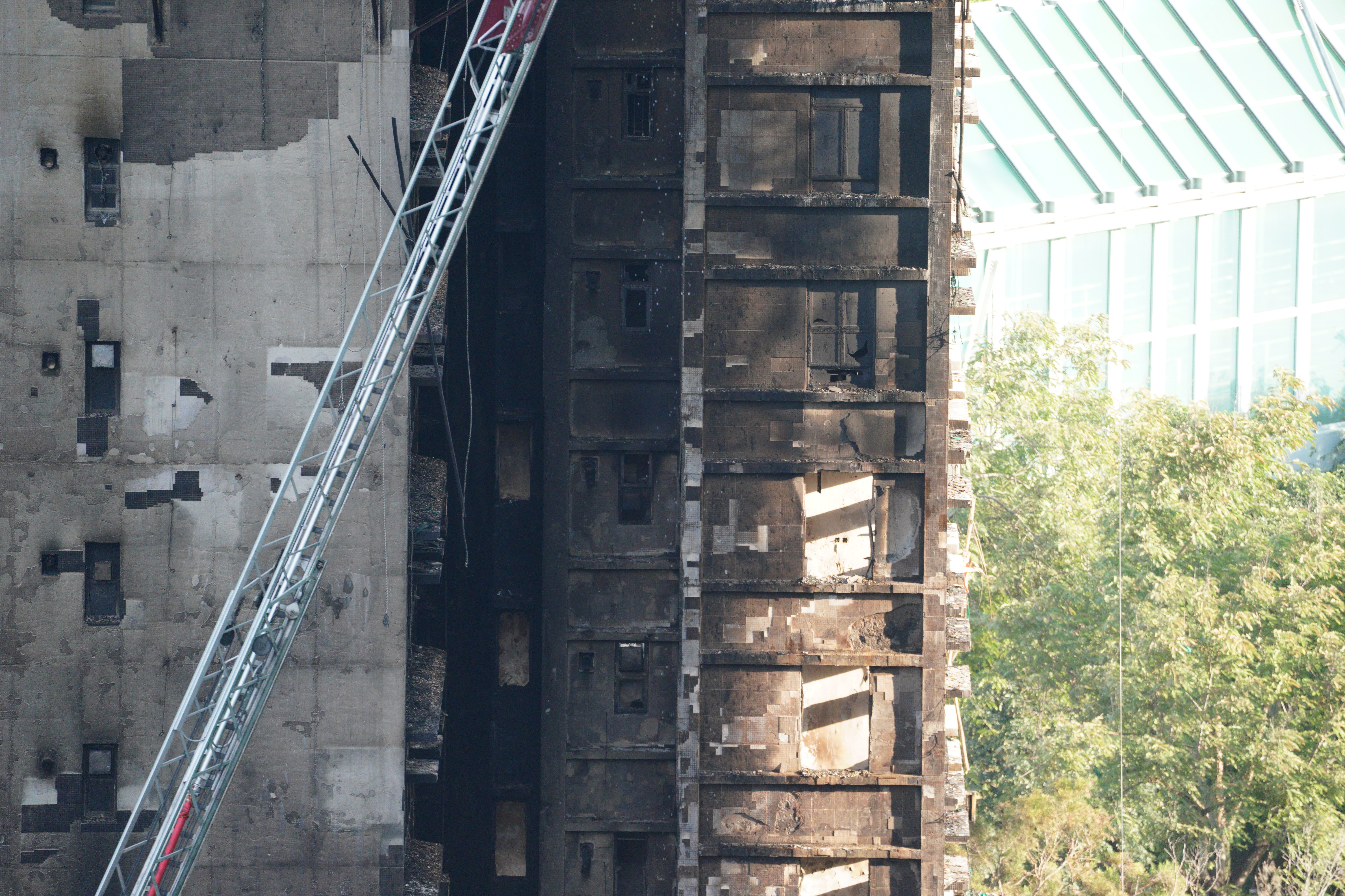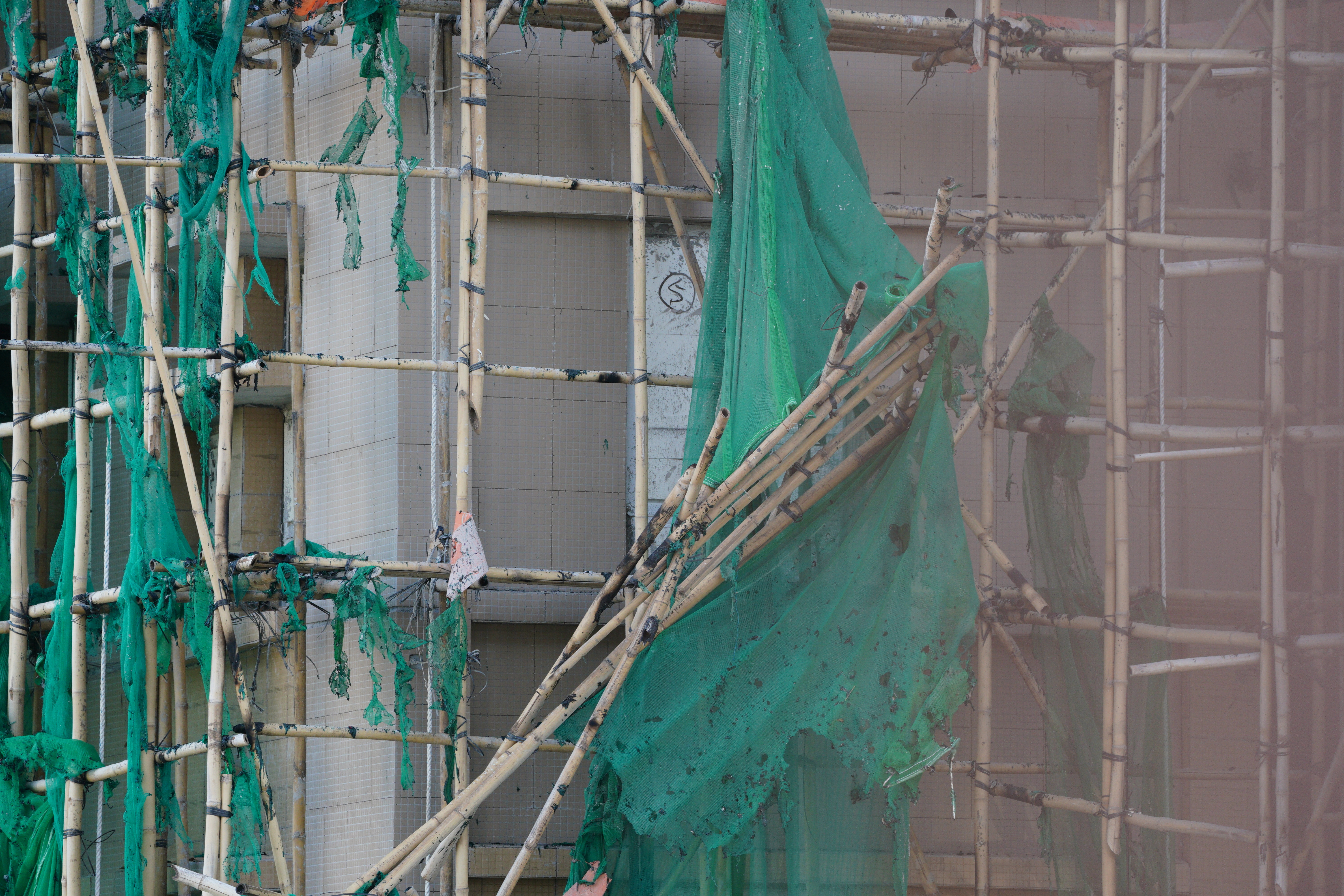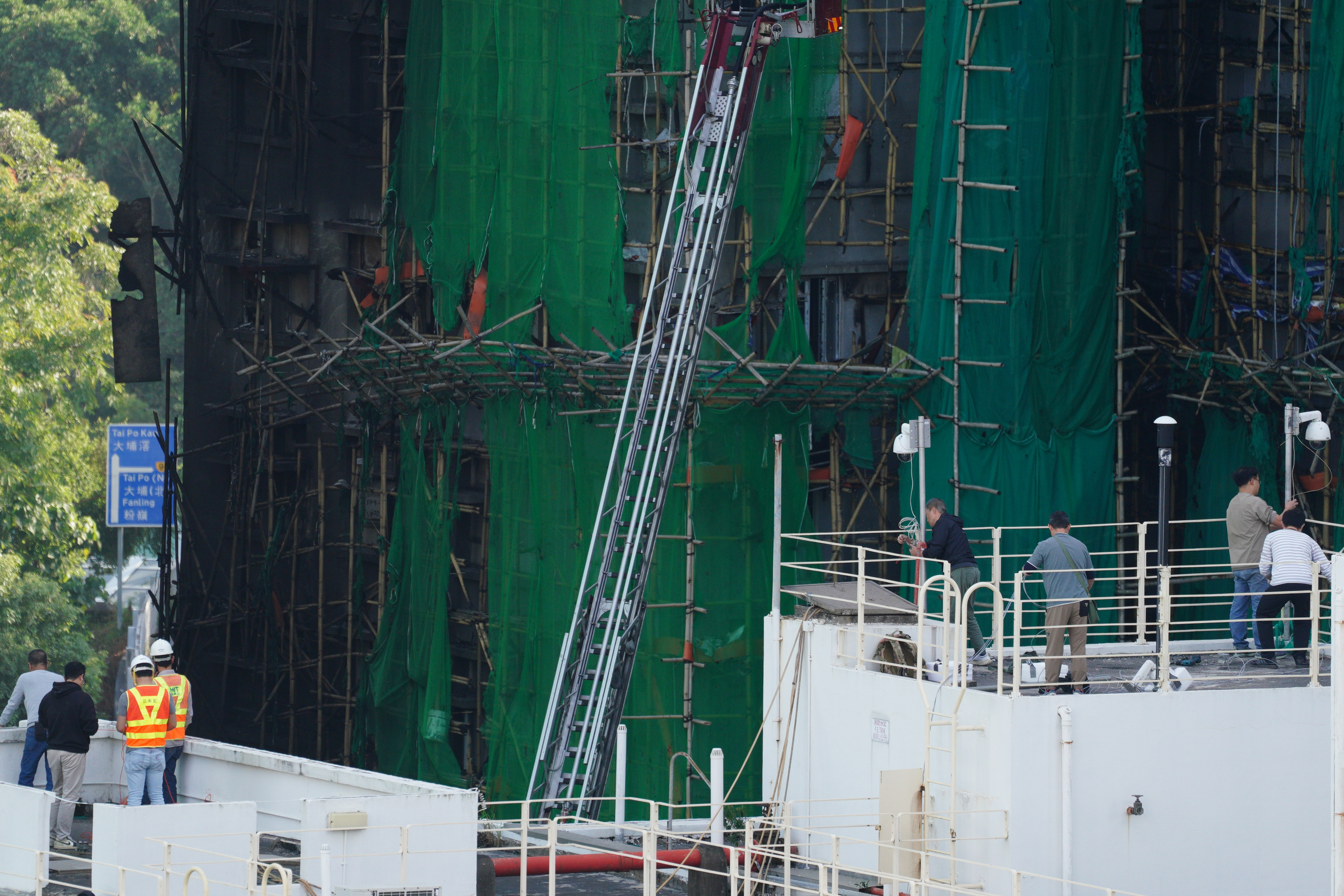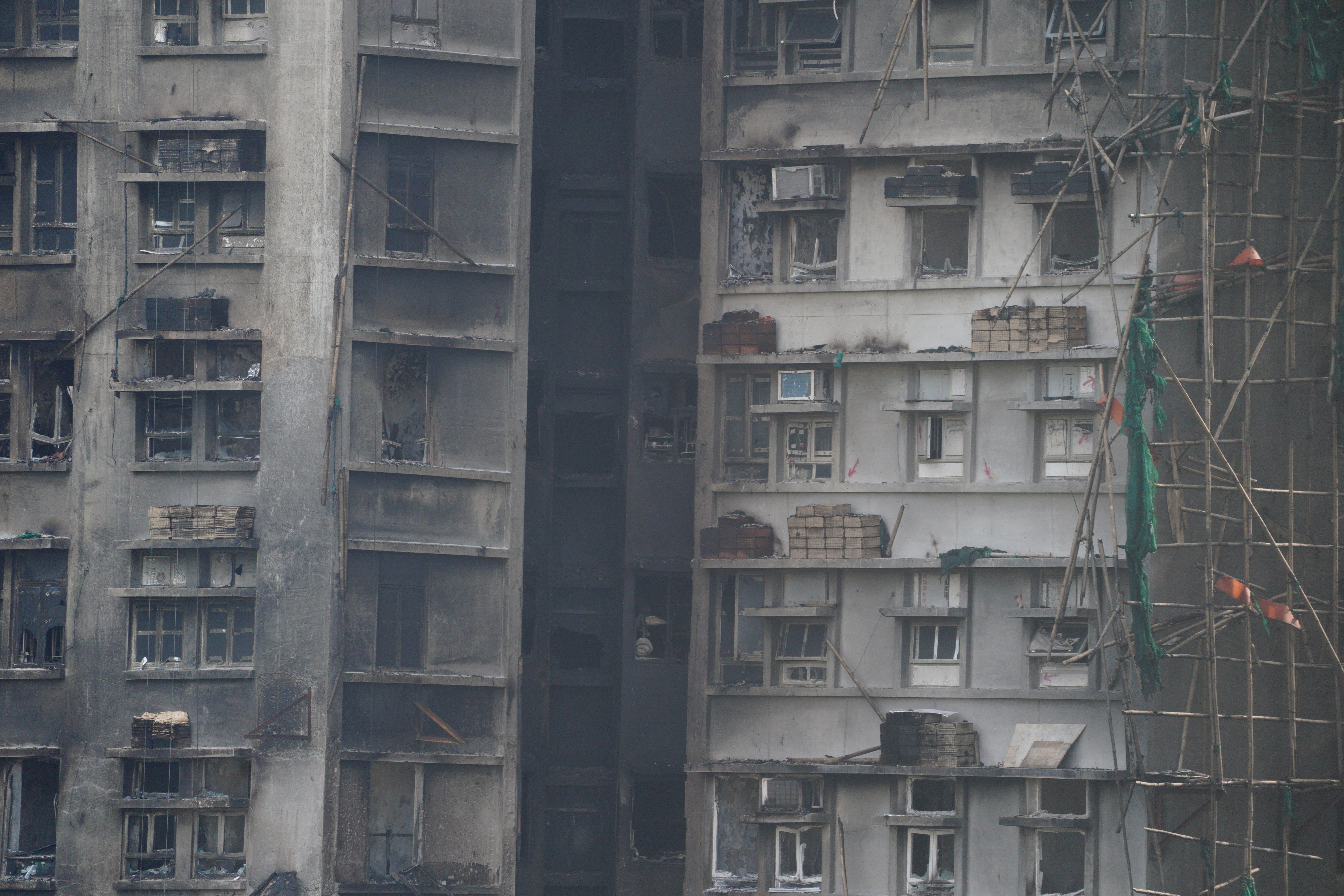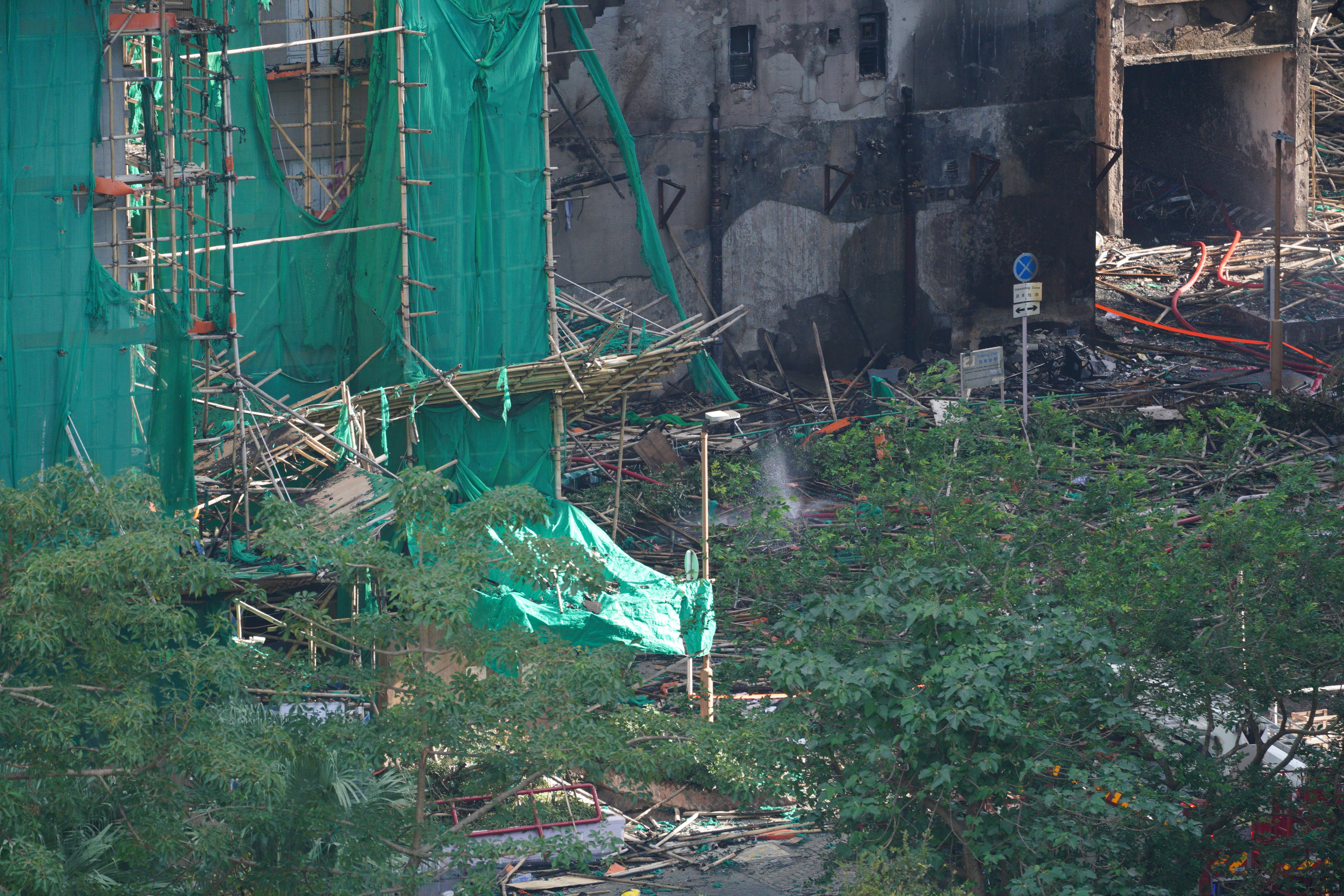 大公文汇网发布的大火熄灭后的画面,不少掉落的竹棚堆积在楼下,甚至堵住了出入口。热点现场香港大埔火灾已致128人遇难