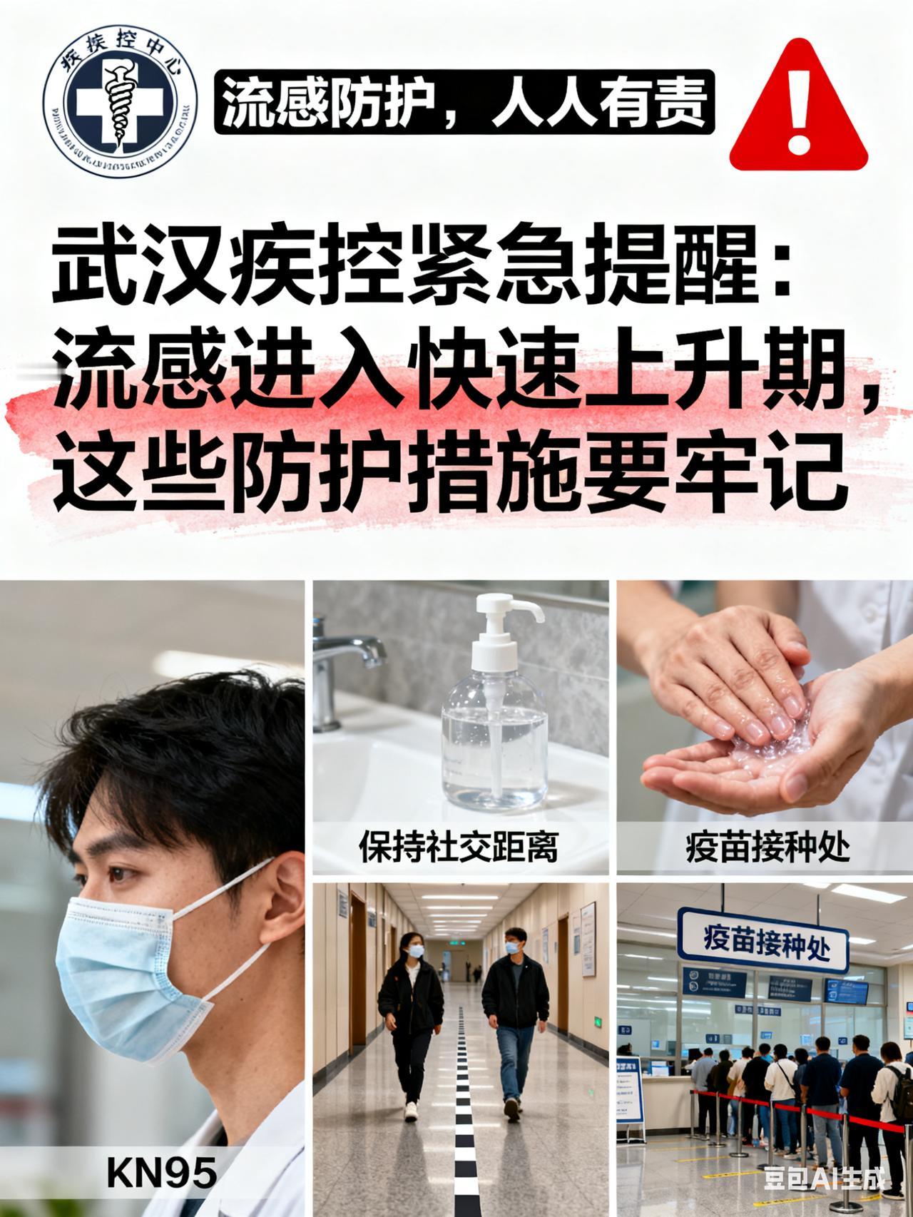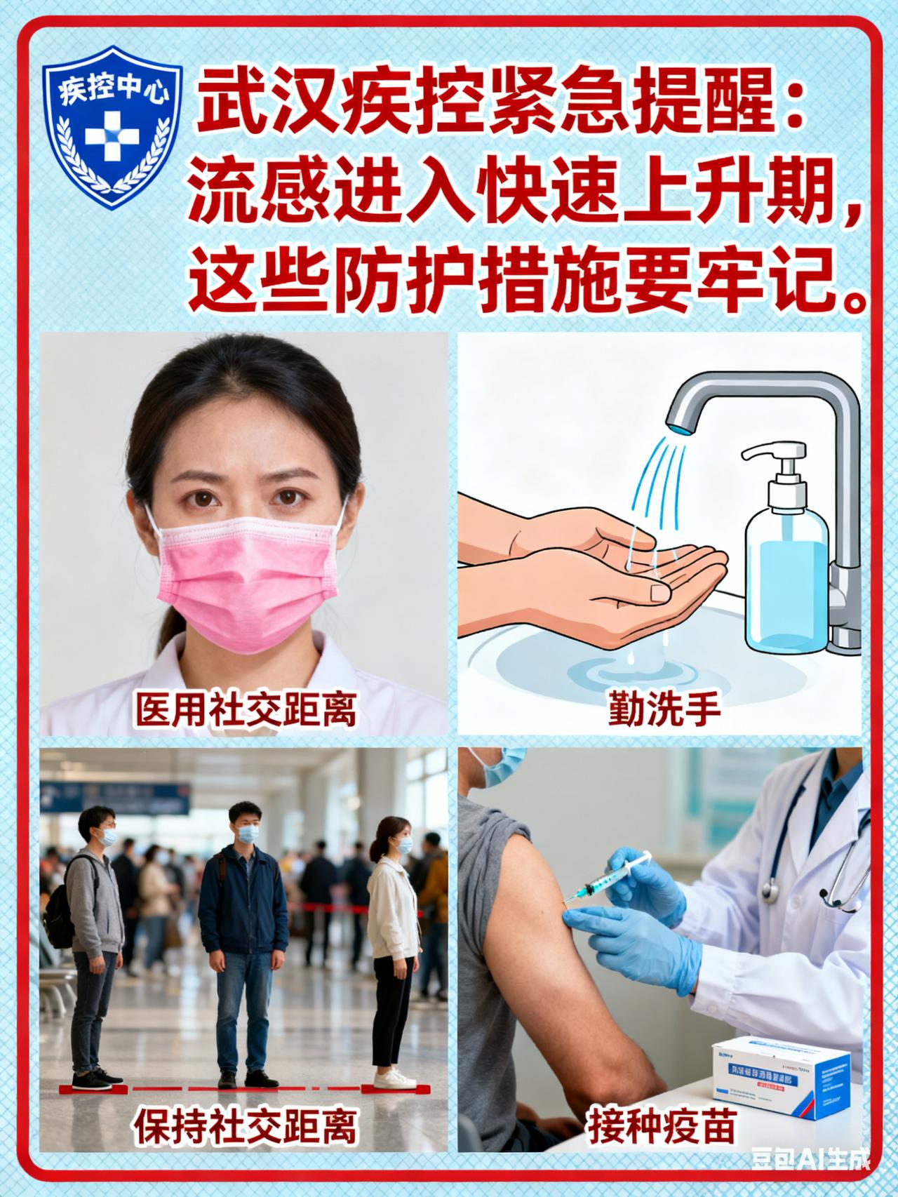 武汉疾控紧急提醒:流感进入快速上升期,这些防护措施要牢记 戴口罩!戴口罩!戴口罩!甲流将进入快速上升阶段! 近期,甲流防控警报再度拉响,多地疾控部门发出紧急预警:甲流即将进入快速上升阶段,这一严峻形势让每一个人都绷紧了神经。而在这场与病毒的较量中,戴口罩这一简单却至关重要的防护措施,再次成为守护我们健康的关键防线。 甲流作为一种急性呼吸道传染病,其传播能力不容小觑。在人员密集的场所,如学校、商场、车站等,病毒就像隐匿在空气中的“幽灵”,悄无声息地寻找着传播的机会。一个感染者不经意间的一声咳嗽、一次打喷嚏,都会释放出大量含有病毒的飞沫。这些飞沫在空气中飘散,周围人一旦吸入,就可能被病毒“趁虚而入”,从而引发感染。 而口罩,就是我们抵御病毒的第一道“盾牌”。医用外科口罩能有效阻挡大部分飞沫,为我们的呼吸道提供基本的保护;N95口罩则拥有更强大的过滤能力,能过滤掉更多微小的病毒颗粒,给予我们更高级别的防护。无论是感染者佩戴口罩,减少病毒的释放量,还是健康人群佩戴口罩,阻挡病毒的入侵,都能在很大程度上切断甲流的传播链,降低感染风险。 当下,甲流快速上升阶段已然临近,我们每个人都应将戴口罩视为日常生活的“必修课”。外出时,无论距离远近、时间长短,都要规范佩戴口罩;在公共场所,即使周围看似“安全”,也不能掉以轻心。同时,要注意正确佩戴口罩,确保口罩与面部紧密贴合,避免漏气。 甲流防控,人人有责。让我们积极行动起来,用小小的口罩,筑起一道坚不可摧的防疫长城,共同守护我们的健康与安全。