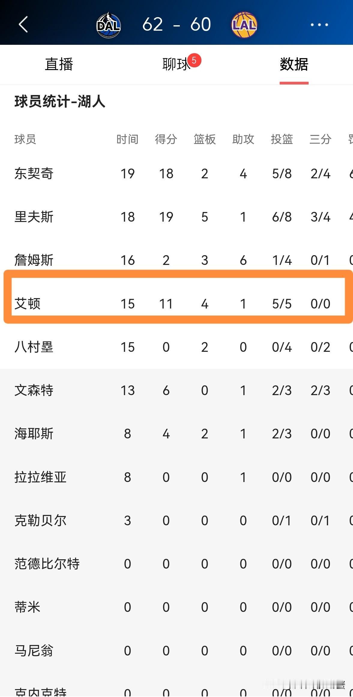湖人超级中锋艾顿真是准的吓人!在今天湖人主场迎战独行侠的上半场比赛中,艾顿首发出战15分钟,投篮5中5,其中罚球2中1极为高效的砍下11分,还有4篮板1抢断。 实事求是的说,艾顿的进攻效率之所以如此的高,主要原因是他的身旁有三大传球高手,艾顿能够在比赛中获得轻松得分的机会。