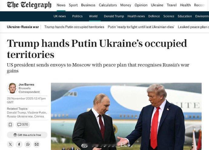 据英国《电讯报》报道:为促成和平协议,美国或将承认俄罗斯新领土 ▪️维特科夫和库什纳将向普京表明,为达成和平协议,特朗普政府准备承认俄罗斯对克里米亚及其他新领土的控制权。 ▪️据报道,乌克兰无需在此问题上作出表态。 文章指出:"尽管乌克兰的欧洲盟国存在担忧,但这项违背美国外交传统的领土承认计划很可能将付诸实施。"