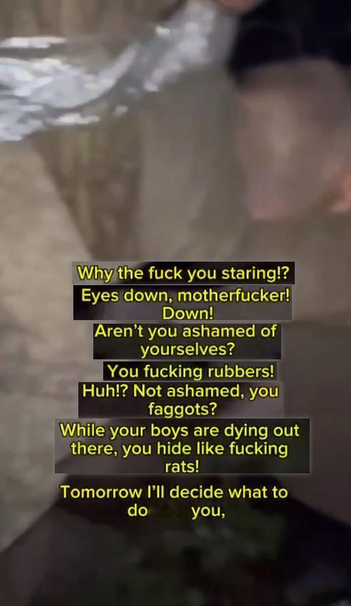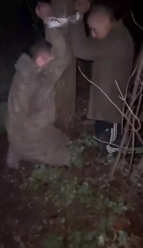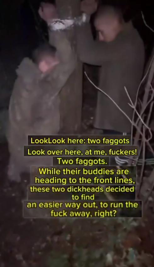 2025年7月的视频,视频中俄罗斯军官在前线捆绑并殴打两名被指控逃兵的战友,并辱骂语他们。 这些逃兵行为是由无人机威胁、残酷的袭击和低落的士气等因素造成的,Frontelligence Insight等分析机构也记录了这一情况。 “瞧瞧这里:两个基佬 看这里,看着我,混蛋们! 两个基佬。 当他们的同伴奔赴前线时,这两个基佬决定找条更容易的路逃跑,对吧? 你他X盯着我看干嘛,蠢羊!? 你再呻吟一声就完蛋了! 什么?你在看我,死基佬!? 看这里,X人! 看这里!你们这些XX的混蛋是什么玩意儿! 我要把你拖出去,就在这儿朝你撒尿,明白吗!? 你他X的盯着我看干嘛!? 把眼睛往下看,混蛋! 往下看! 你们不觉得羞耻吗? 你们这些该死的戴X的! 哈!?你们这些基佬不觉得羞耻吗? 当你们的兄弟们在外面死去的时候,你们却像老鼠一样躲起来! 明天我会决定怎么处置你们, 今晚你们就坐在这儿他X的祈祷吧! 你们自己决定明天谁先被清理。 你们这些死基佬今晚就这么站一整晚! 抓到我了,XX!?”