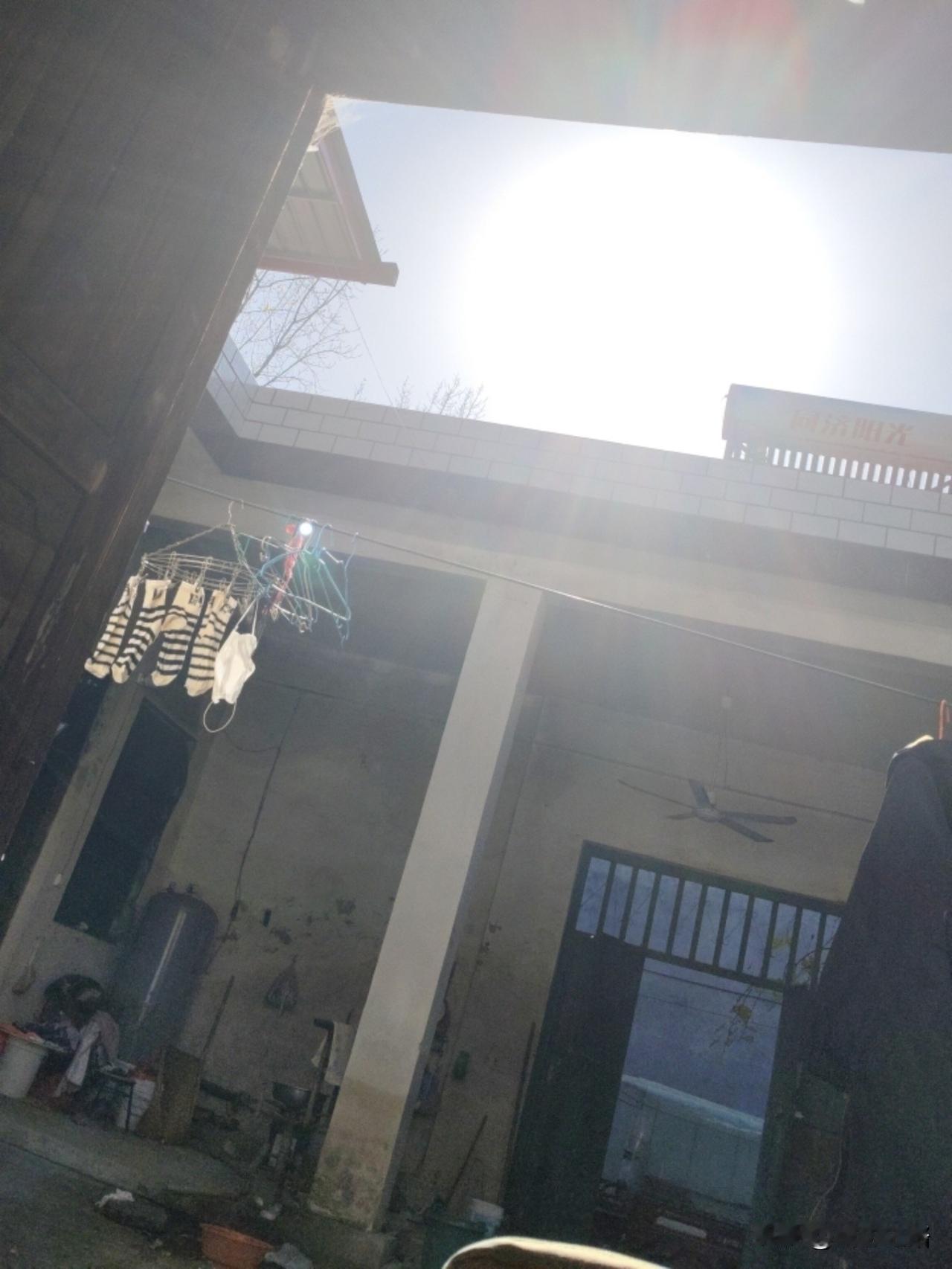 这就是我家堂前那片小地方,抬头能瞅见天,太阳一晒亮堂堂的。墙是老水泥墙,都泛着点灰了,中间一根大白柱子支着顶。 晾衣绳上挂着娃那黑白条纹的小袜子,旁边还耷拉着个口罩,几个衣架缠一块儿。墙角堆着水壶、旧盆,顶上吊扇转起来嗡嗡响。远处墙头上露着“阳光”俩字,那是我家的太阳能热水器上的名子。是不是不太显眼? 这儿乱是乱点,但晒个衣裳、搁点零碎正合适,一进门就觉得是自个儿家那味儿。