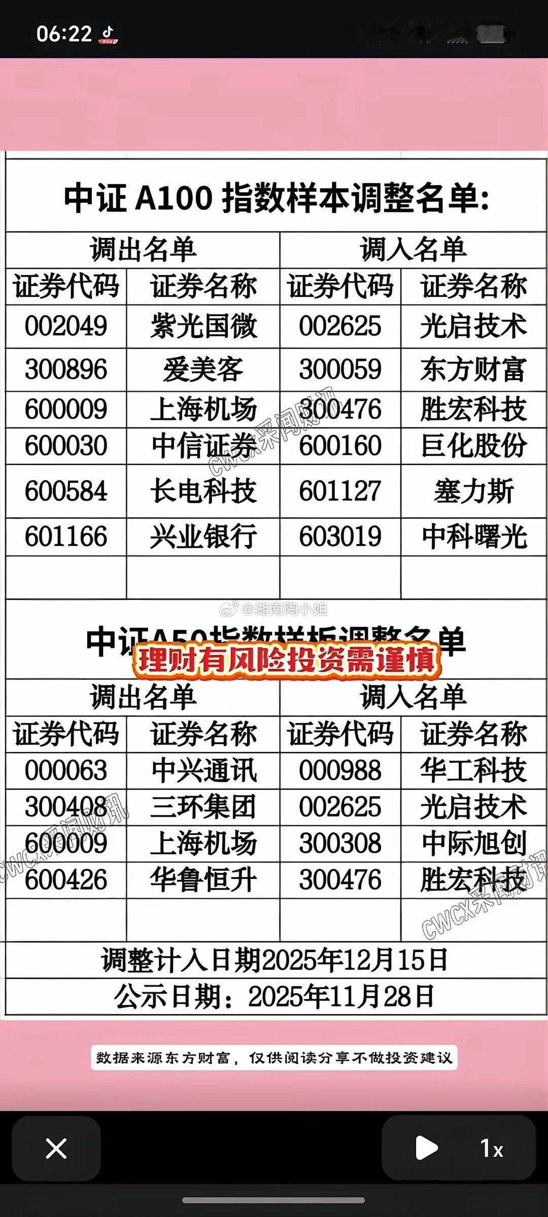 11.29周六:中证A100指数样本调整名单中证A50指数样本调整名单!