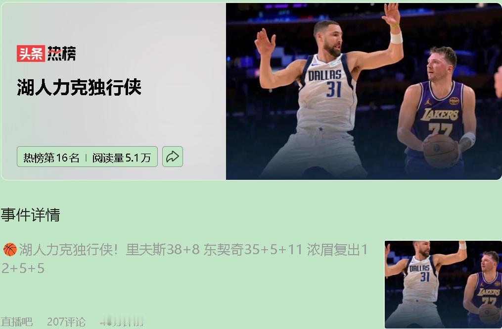你有没有过这种感觉?看着别人闪闪发光,突然怀疑自己是不是不够好。这场比赛,浓眉大概懂了这个滋味。 复出的第一场,面对老东家湖人。他本该是主角,结果只拿了12分。对面的艾顿9中8,效率爆棚。网上有人开始说:看吧,离开湖人连呼吸都是错的。 可真相呢?里夫斯拿了38分,东契奇35分。詹姆斯只出手9次,得了13分,末节一个三分就下班了。湖人六连胜,靠的不是谁单打独斗。 里夫斯去年还在被质疑"只会蹭詹姆斯",今天三分箭箭穿心,刷新生涯纪录。东契奇刚被交易时多少人骂他"拆队专家",现在用11次助攻让全队活过来。詹姆斯打了22年,终于能放心把球交出去,站在底角笑笑。 独行侠那边,八人上双,数据挺好看。但关键时刻里夫斯和东契奇连拿13分,直接带走比赛。不是独行侠不努力,是湖人找到了更好的答案——球够分,人才能赢。 浓眉的尴尬,其实是所有"回归者"的缩影。想证明自己,反而束手束脚。可谁没有这种时候呢?新环境、新角色,总得给自己点时间。就像里夫斯也曾坐冷板凳,东契奇也被嘘过。 这场比赛治愈了我。真正的强大,不是永远当主角,而是敢让别人发光。詹姆斯可以"躺赢",是因为他早就不需要用分数证明自己。湖人能赢,是因为每个人都找到了自己的位置。 独行侠别着急。浓眉没输,他只是需要时间。弗拉格他们也没输,年轻就是这样,先热闹着,再找默契。 你看,篮球说到底,还是五个人的事。生活里也一样,允许自己暂时不够好,才能慢慢变好。