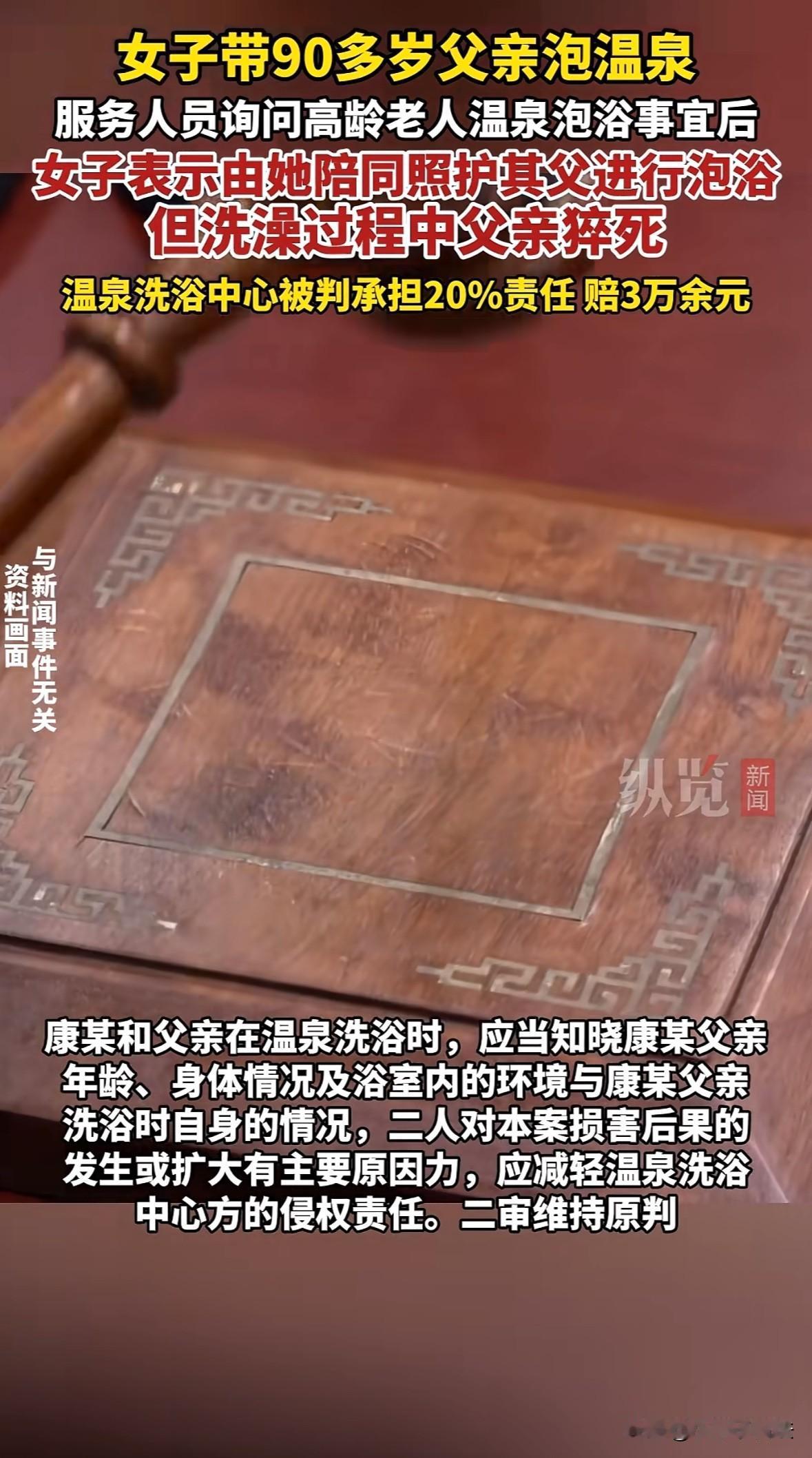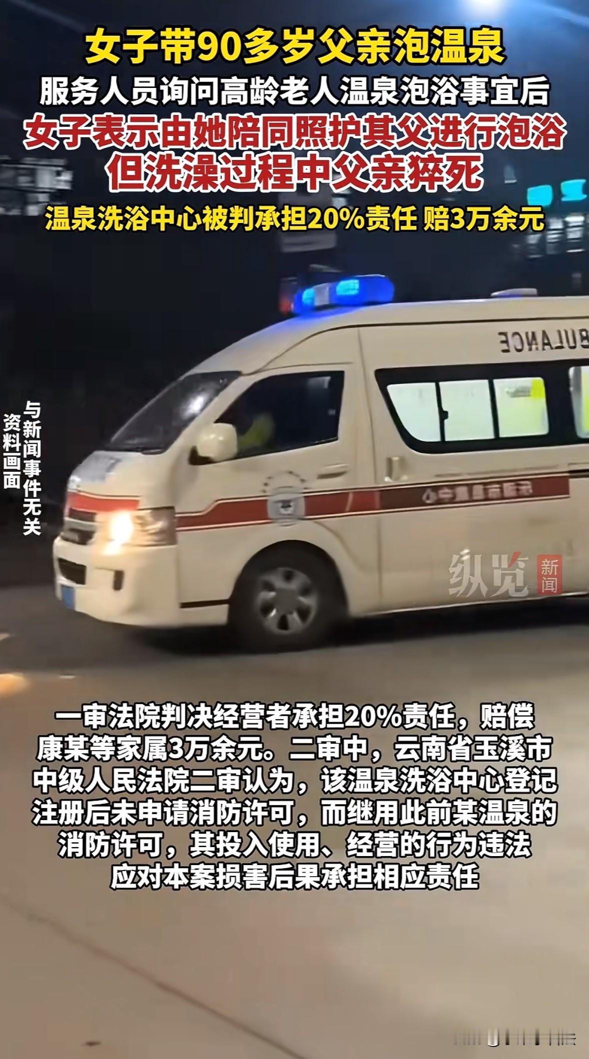 云南玉溪,女子和1934年出生的父亲到温泉洗浴中心洗澡,前台服务员看到女子父亲便询问高龄老人温泉泡浴事宜,女子表示会陪同并照护父亲泡浴,前台这才敢收下120元门票将二人带入浴池。岂料洗浴过程中女子父亲猝死,女子和家属就把温泉洗浴中心告上法庭索赔。法院认为温泉洗浴中心已尽到通常注意义务,但判决结果引发热议。 康某负责照看年迈的父亲多年,几乎没有犯过错。在康某的照看下,老康的身子骨也很硬朗,经常会跟康某一同外出,可偏偏在一次外出洗澡时发生了意外。 在2024年11月23日的下午,康某正好周末休息,就想带着已经90多岁高龄的父亲去新开的一家温泉洗浴中心消遣。 老康在这之前经常会和女儿康某去洗浴中心洗澡,对于新开的这家温泉洗浴中心,老康也很想去见识一下,听说还挺不错的。 康某和父亲来到温泉洗浴中心后,前台服务员看到老康的样貌,就冒昧的询问了一下老康的年纪,康某告诉服务员父亲已经过了90岁高龄了。 服务员意识到老康属于是高龄老人,就向康某和老康询问高龄老人温泉泡浴事宜。 因为温泉洗浴中心并不是一般的只有洗澡的功能,还有泡温泉的项目。温泉的水温都是偏高的,对于高龄老人的心肺承受能力是很有限制的。 康某在熟知了服务员的表述后,表示会陪同并照顾父亲泡浴,让服务员放心,不会出意外的。而老康也没有提出任何反对意见,是同意女儿的说法的。 既然家属和本人都没有异议,服务员就正常收取了两个成年人的门票120元后,便将两个人带入浴室。 进入到浴室后,温泉洗浴中心的工作人员就没再过多关注过康某和其父亲,直到听到一声喊叫,温泉洗浴中心的工作人员才来到浴室门口,发现了老康的异常情况。 康某已经无计可施,温泉洗浴中心的工作人员见状赶紧拨打120,并赶紧对老康采取紧急急救措施。 温泉洗浴中心的工作人员尽职尽责的一直在对老康施救,直到120的工作人员赶到现场才将老康交给专业的急救工作人员。 120的急救工作人员迅速展开急救,但还是没能够挽救回来老康的生命,当场确认其死亡。 随后不久警方也赶到现场,在确认老康已无生命体征后,对其进行检查。医疗机构给出的死因是猝死,公安部门认定老康属于正常死亡,排除他杀可能。 好端端的一次洗浴,竟然夺走了老康的姓名。康某回到家后备受家里人的指责,康某也感觉很愧疚。 但是康某表示父亲身体一直很健康,以前也有过到洗浴中心洗澡的经历,偏偏在新开的那家温泉洗浴中心就发生的意外,就认为父亲的死亡与温泉洗浴中心脱不开关系。 于是康某及其家属一起,将温泉洗浴中心告上法庭,要求其赔偿医疗费、死亡赔偿金、丧葬费等各类费用。 根据警方到现场后了解到的情况可以认定,康某带着年过90岁高龄的父亲到温泉洗浴中心洗澡时,工作人员曾特意对其嘱咐过高龄老人温泉泡浴事宜。 根据《民法典》第1198八的规定:宾馆、商场、银行、车站、机场、体育场馆、娱乐场所等经营场所、公共场所的经营者、管理者或者群众性活动的组织者,未尽到安全保障义务,造成他人损害的,应当承担侵权责任。 康某和其父亲对工作人员的嘱咐也是知晓并认可的,而且康某表示自己会陪同并照护好父亲,所以温泉洗浴中心认为自己并没有任何过错。 要说有过错,也是康某对其父亲自身情况期望过高,以至于没有尽到身为子女的谨慎注意到责任和义务,应该由其子女自身承担责任。 温泉洗浴中心的工作人员在听到康某大叫后,第一时间赶到现场进行施救并拨打120报警,已经做到身为经营者应尽的责任和义务,不应再追加其赔偿责任。 康某对温泉洗浴中心的表述和警方出具的相关证明是认可的,法院也认定温泉洗浴中心已经履行安全保障义务,尽到通常注意到义务。 根据《消防法》第15条的规定:公众聚集场所在投入使用、营业前,建设单位或者使用单位应当向场所所在地的县级以上地方人民政府消防救援机构申请消防安全检查。公众聚集场所未经消防救援机构许可的,不得投入使用、营业。 经查实,温泉洗浴中心并没有得到消防救援机构的许可,其经营行为违法。温泉洗浴中心持有的消防救援机构的许可是上一家洗浴中心的,续用的行为违法。 考虑到温泉浴室内的气温、通风、水温以及浴室内部的设施设备不符合行业规范,康某父亲猝死的诱因因此而扩大。 因此温泉洗浴中心对康某父亲的死亡存在过错,考虑到实际错过程度,应由温泉洗浴中心承担20%的民事赔偿责任,法院判决赔偿康某及其家属3.6万元。 温泉洗浴中心不服提起上诉,二审维持原判。