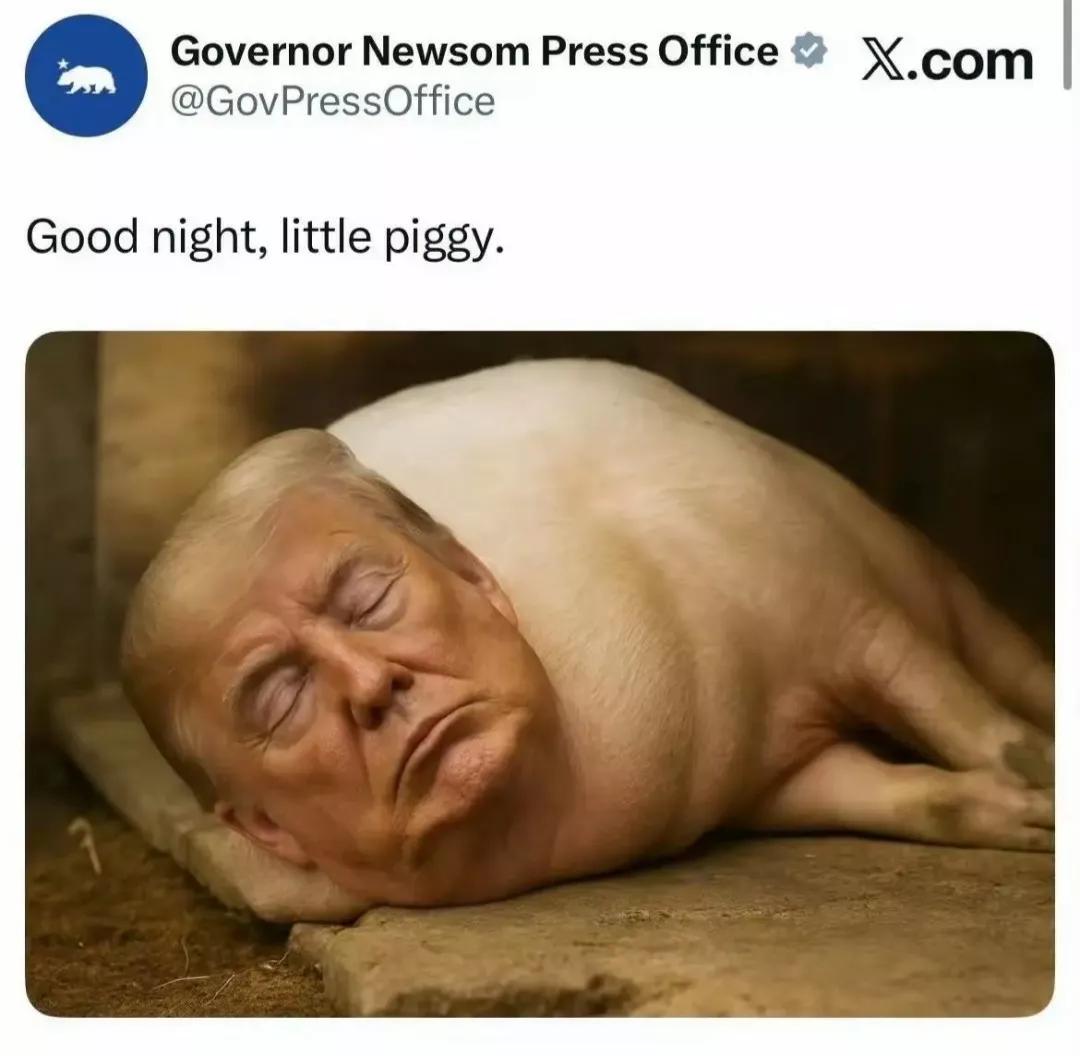 加州的州长纽森在X上发了一张羞辱川普的图片,把川普P成了一头猪,这种人身攻击在美
