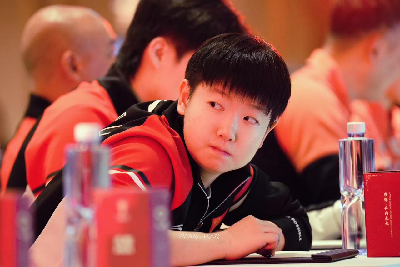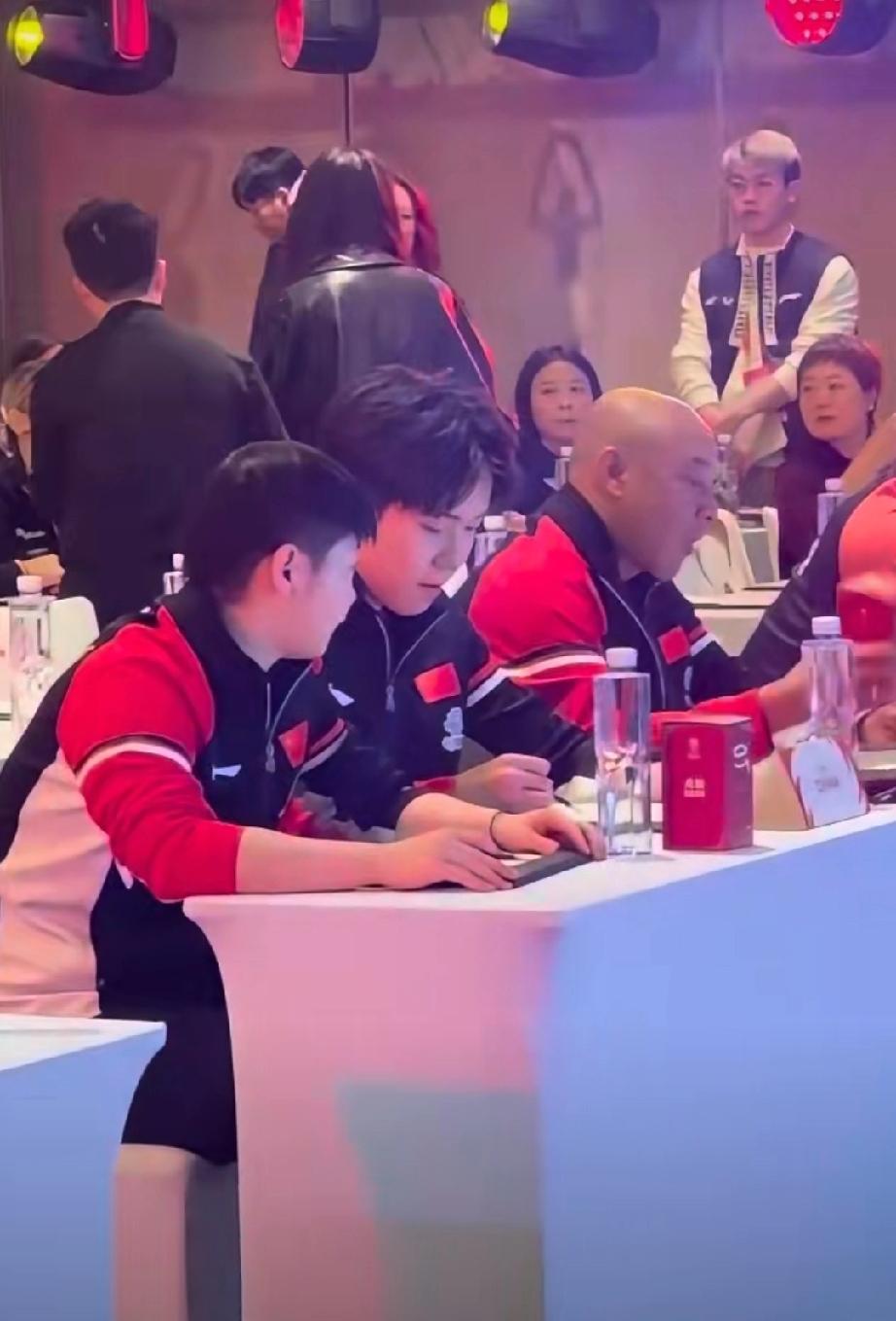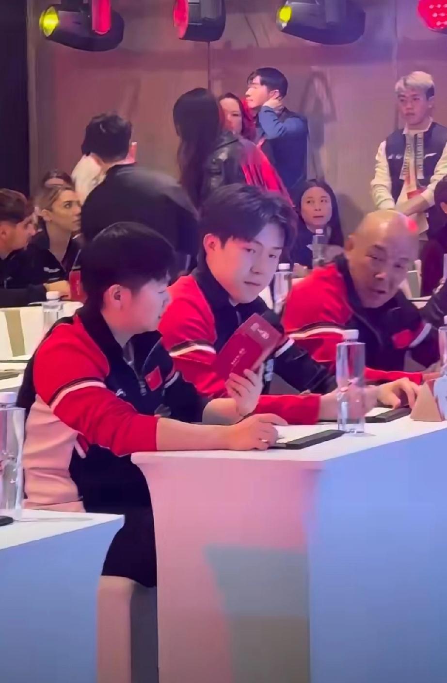成都混合团体世界杯抽签仪式,男女世界第一王楚钦孙颖莎代表中国队出席。混双教练肖战代表国乒教练组出席。 孙颖莎王楚钦入座后,王楚钦看到有纸笔,便开始自己一年一度的绘画大计。 孙颖莎则注意到眼前桌子上摆放的装饰物,拿起来与王楚钦一起研究。