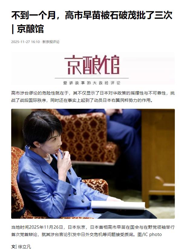 能感受到日本当下确实因为对华关系陷入了前所未有的纠结,一边是和中国的摩擦不断升级,一边是国内对对外政策的争吵快摆上台面,这种分裂在政界表现得最直接,石破茂站出来连续批评高市早苗,确实像股清流,尤其还敢提历史教训,这份勇气在现在的日本政坛不多见。 先得说清楚,日本现在对华政策的紧张局面,根子就在高市早苗的激进操作上。 这位刚上台的首相像是完全没把中日关系的底线当回事,在国会里公然说“台湾有事”可能算日本的“存亡危机事态”,暗示自卫队能武力介入,这已经不是简单的强硬,而是直接踩破了1972年中日邦交正常化以来的规矩。 要知道,从田中角荣那时候起,历届日本政府处理台湾问题都是“小心、小心、再小心”,就怕触碰中国的核心利益,高市倒好,为了迎合国内右翼、拉点支持率,直接把多年的默契抛到脑后。 更让人不安的是,她不光在台湾问题上越线,还赶着把防卫费提到GDP的2%,要改《国家安全保障战略》,甚至想动“无核三原则”的念头,这一系列动作下来,中日关系能不紧张吗?这种冒进做法直接引爆了日本社会的讨论,两边的声音吵得厉害。 支持高市的大多是党内右翼和保守势力,他们觉得跟着美国强硬对华能刷存在感,还能靠扩军拉军工产业的支持,对高市的错误言论不仅不纠正,反而帮着找借口。 但更多理性的声音开始着急,商界、学界还有不少普通民众都在喊要调整政策,怕再这么下去日本经济先扛不住。 毕竟中国连续12年都是日本最大的贸易伙伴,日本的食品、稀土、医药品好多都得从中国进口,连种庄稼的磷肥都高度依赖中国供应。 高市一句话,之前石破茂任期内好不容易恢复的水产品、牛肉进口谈判全黄了,中国大陆赴日游客一下少了好多,光取消的机票就有50多万张,野村研究所算过,这一下可能让日本GDP少涨0.29%,三季度日本GDP已经环比降了0.4%,再这么折腾谁顶得住?就在这时候石破茂站了出来,不到一个月里连着批评了高市三次,每次都戳在要害上。 11月23号的电视节目里,他直接说外交不能图一时嘴瘾,更不能为了支持率就乱说话;后来的演讲里更直接,问出“没有与中国的关系,我们的国家还能成立吗?”这种直击本质的问题。 他反复强调,尊重中国的台湾立场是历届政府的底线,这是不能改的规矩,这话不光是说给高市听的,更是说给那些被右翼情绪裹挟的政客听的。 最难得的是他敢提历史教训,2025年正好是二战结束80周年,他之前就在国际会议上呼吁日本要铭记历史、别再走战争老路,现在又拿这个劝诫政府,要知道在日本政坛,敢公开提历史反省很容易被骂“卖国”,这份政治勇气确实少见。 石破茂能成为清流,还因为他的批评不是单纯的政治对立,而是有实打实的现实依据。 他当过首相,清楚中日关系对日本经济的重要性,知道那些看似强硬的表态,最后买单的是日本企业和普通民众。 而且他的立场也不是孤立的,前首相鸠山由纪夫就跟着批评高市,说她把中日关系搞到最糟,还引用《论语》劝她认错;社会民主党党首更直接,说高市的话既违宪又违法,连内阁自己都有点圆不下去,后来发答辩书说“立场没变”,其实就是变相承认高市说错了。 这场争论本质上是日本对华政策的路线之争:是跟着高市走激进对抗的老路,还是像石破茂说的那样回归谨慎务实。 高市的问题在于她只看到了美国的压力和国内的短期政治利益,却忘了日本和中国一衣带水,经济上深度绑定,历史上还有过战争教训,强硬路线从来没有好结果。 石破茂的清醒之处,就在于他明白中日关系不是可以随便折腾的政治筹码,守住一个中国原则、保持外交谨慎,不是怕中国,而是为了日本自己的利益。 现在日本的处境已经很明白,高市的拒不认错只会让日本在经济上受损、外交上孤立,而石破茂的呼吁恰恰点出了关键:和中国搞对抗没有赢家,只有正视历史教训、回到务实轨道,才能避免再走错路。 这种基于现实和历史的理性声音,在当下的日本政坛确实太稀缺了。
