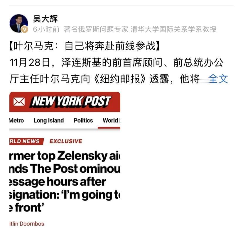 叶尔马克发文,他说他将奔赴前线!硬气,这才是最好的回答,最好总统也上前线,大家一下就心服口服了,乌克兰招兵也容易了,比口嗨有说服力,如果捐躯,绝对是大英雄,如果参与签字,绝对没好下场!