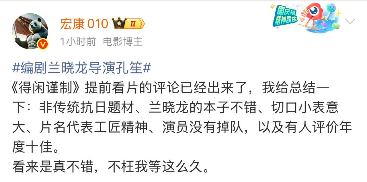 刚刚看到有人吐槽说肖战电影《得闲谨制》的看片人反馈话术怎么都差不多?不会是片方买的吧? 只能说有些人想太多了。感觉看片人们聊起《得闲谨制》都聊嗨了,说美了。一个个的反馈都是各不相同,而不是统一的用“炸裂”来敷衍。 大家都说内容很好,有理有据的,这种不是假大空的评论就非常有说服力,连某个被称为“吐槽王者”的博主都说内容不错。 其实也是嘛,这部电影无论从编剧、导演、演员、制作方来看没一个不厉害的,这样的电影怎么可能不好? 至于吐槽的人不如等电影上线去评判评判不就知道片子如何了嘛?