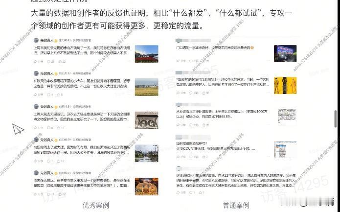 都说要“垂直”一个领域,可我偏有点其他不一样想法! 我有时候也在琢磨,平台总说必须死磕一个垂直领域,流量才会稳定。专门写旅游探店、科技,平台就给你贴标签,推流量——这话听起来很有道理,但现实好像不完全是这样。 你看那些写热点的,今天民生,明天科技,后天军事教育,啥都敢碰。人家粉丝也不少啊! 为什么?因为热点本身自带巨大流量池,平台一开闸,展现量就惊人。只要作者逻辑清晰,写得有理有据,内容本身够硬,粉丝自然就来了。 当然,平台鼓励垂直有它的道理——那是对本身就有深厚知识储备的大牛最稳妥的路。 但说实话,大部分人哪有那么专精的领域? 硬要“垂直”,可能反而束手束脚,写不出深度,也未必篇篇精彩。 所以我的结论是,规则要参考,但不必被束缚。关键在于找到自己输出价值的节奏:无论是深耕一方,还是追逐热点,最终能留住人的,永远是你内容里那点真东西和有价值的思考。