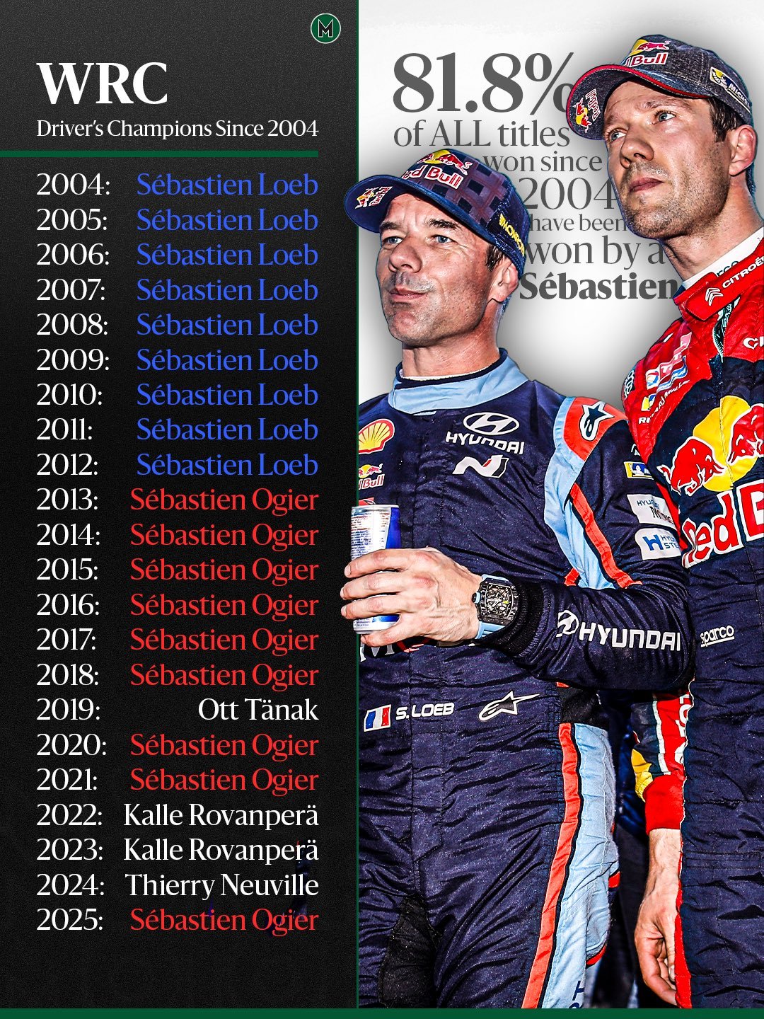 【吓哭了】在过去的22个WRC赛季,“塞巴斯蒂安”赢下了18个车手世界冠军,世冠达成率高达81.8……🤯🇫🇷🏆📈 Motor Sport magazineWRC世界拉力锦标赛赛车