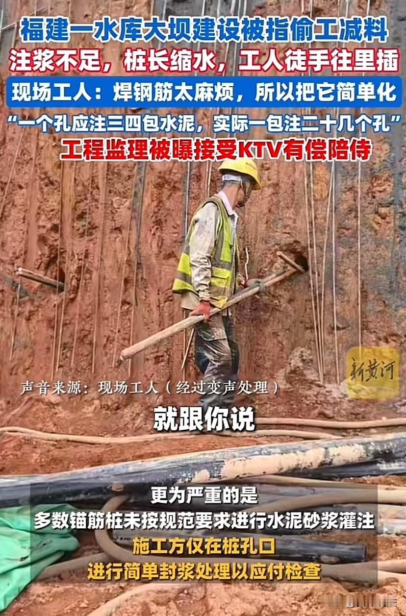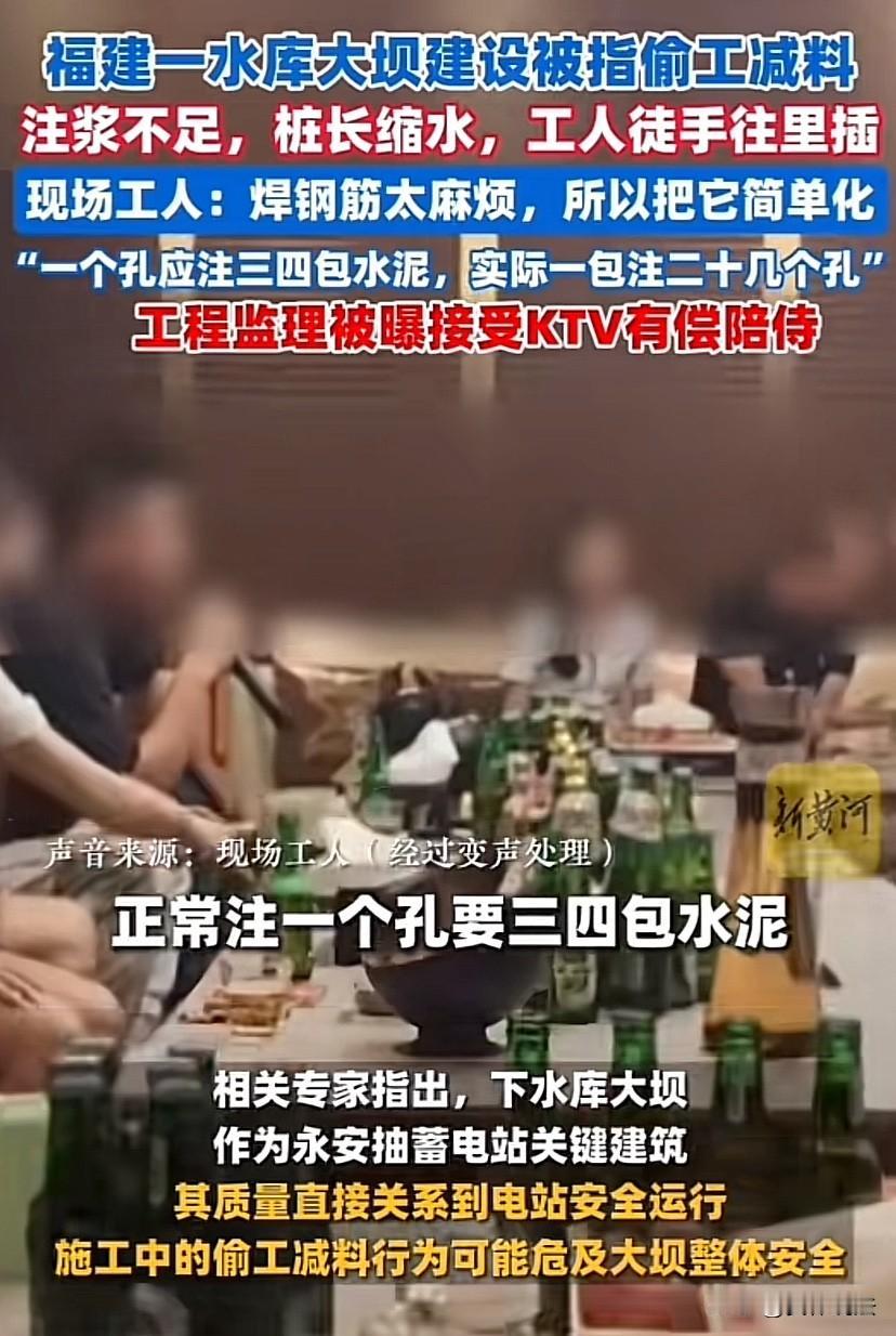 福建三明永安,耗资75亿元的重大民生工程抽水蓄能电站在建的下水库工程被指在大坝施工中存在严重偷工减料问题,数百根锚筋桩长度大幅缩水,部分桩长甚至不足设计标准的三分之一。 锚筋桩本该用水泥砂浆灌注,施工方竟然仅在桩孔口进行简单封浆处理以应付检查。 记者还发现,监理公司的多名监理人员曾接受施工方宴请,在KTV娱乐场所饮酒唱歌,每人身边均有一至两名异性有偿陪侍人员。而且还不是第一次! 什么是锚筋桩? 所谓锚筋桩其实就是一种通过钻孔或挖孔形成桩体,利用钢筋与混凝土嵌制作用加固岩土体的建筑结构,常用于边坡、隧道、坝基等工程。 锚筋桩偷工减料相当于给水库 “拆骨头”,严重的可能直接导致水库边坡失稳、甚至水库溃决等后果,威胁下游居民生命财产安全‌。 施工方 “缩水” 施工,监理方 “放水” 监督,这波操作不仅缺德,其实已经涉嫌违法甚至犯罪! 《建设工程质量管理条例》第64条规定,违反本条例规定,施工单位在施工中偷工减料的,使用不合格的建筑材料、建筑构配件和设备的,或者有不按照工程设计图纸或者施工技术标准施工的其他行为的,责令改正,处工程合同价款2%以上4%以下的罚款;造成建设工程质量不符合规定的质量标准的,负责返工、修理,并赔偿因此造成的损失;情节严重的,责令停业整顿,降低资质等级或者吊销资质证书。 第67条规定,工程监理单位有下列行为之一的,责令改正,处50万元以上100万元以下的罚款,降低资质等级或者吊销资质证书;有违法所得的,予以没收;造成损失的,承担连带赔偿责任: (一)与建设单位或者施工单位串通,弄虚作假、降低工程质量的; (二)将不合格的建设工程、建筑材料、建筑构配件和设备按照合格签字的。 第68条规定,违反本条例规定,工程监理单位与被监理工程的施工承包单位以及建筑材料、建筑构配件和设备供应单位有隶属关系或者其他利害关系承担该项建设工程的监理业务的,责令改正,处5万元以上10万元以下的罚款,降低资质等级或者吊销资质证书;有违法所得的,予以没收。 出现这样的问题,涉事施工单位,不仅要承担返工、赔偿责任,还将面临巨额罚款、甚至降低、吊销资质。 监理单位也跑不了,需要与施工单位承担连带赔偿责任,被没收违法所得,同时也面临巨额罚款、甚至降低、吊销资质。 应当注意的是,偷工减料的后果可不只是如此而已! 《刑法》第137条规定,建设单位、设计单位、施工单位、工程监理单位违反国家规定,降低工程质量标准,造成重大安全事故的,对直接责任人员,处5年以下有期徒刑或者拘役,并处罚金;后果特别严重的,处5年以上10年以下有期徒刑,并处罚金。 如果因为偷工减料导致重大安全事故,施工、监理单位直接责任人员一个都跑不掉,还将面临刑事追责! 《刑法》第163条第1款规定,公司、企业或者其他单位的工作人员,利用职务上的便利,索取他人财物或者非法收受他人财物,为他人谋取利益,数额较大的,处3年以下有期徒刑或者拘役,并处罚金;数额巨大或者有其他严重情节的,处3年以上10年以下有期徒刑,并处罚金;数额特别巨大或者有其他特别严重情节的,处10年以上有期徒刑或者无期徒刑,并处罚金。 第164条第1款规定,为谋取不正当利益,给予公司、企业或者其他单位的工作人员以财物,数额较大的,处3年以下有期徒刑或者拘役,并处罚金;数额巨大的,处3年以上10年以下有期徒刑,并处罚金。 而根据相关司法解释的规定,对非国家工作人员行贿以及非国家工作人员受贿金额达到6万元就可以立案追诉。 施工方人员为了让监理人员睁一只眼闭一只眼,宴请监理人员不是“人情”而是对非国家工作人员行贿,监理人员接受宴请放弃监督,则是非国家工作人员受贿! 最后,工程质量无小事,民生工程更是良心工程,容不得半点投机取巧! 据悉相关部门已经介入调查此事! 希望不要姑息! 这事您怎么看?欢迎在评论区留言,与大家一起交流您的看法! ------ 关注@安律说法 案例中看人生百态,法律中寻破局之法!