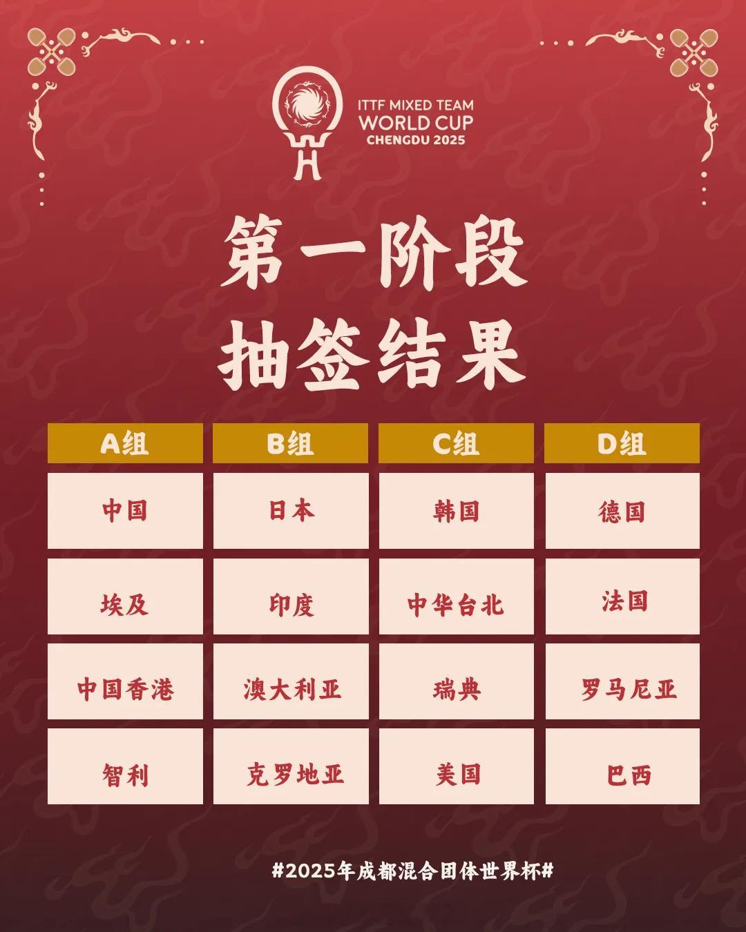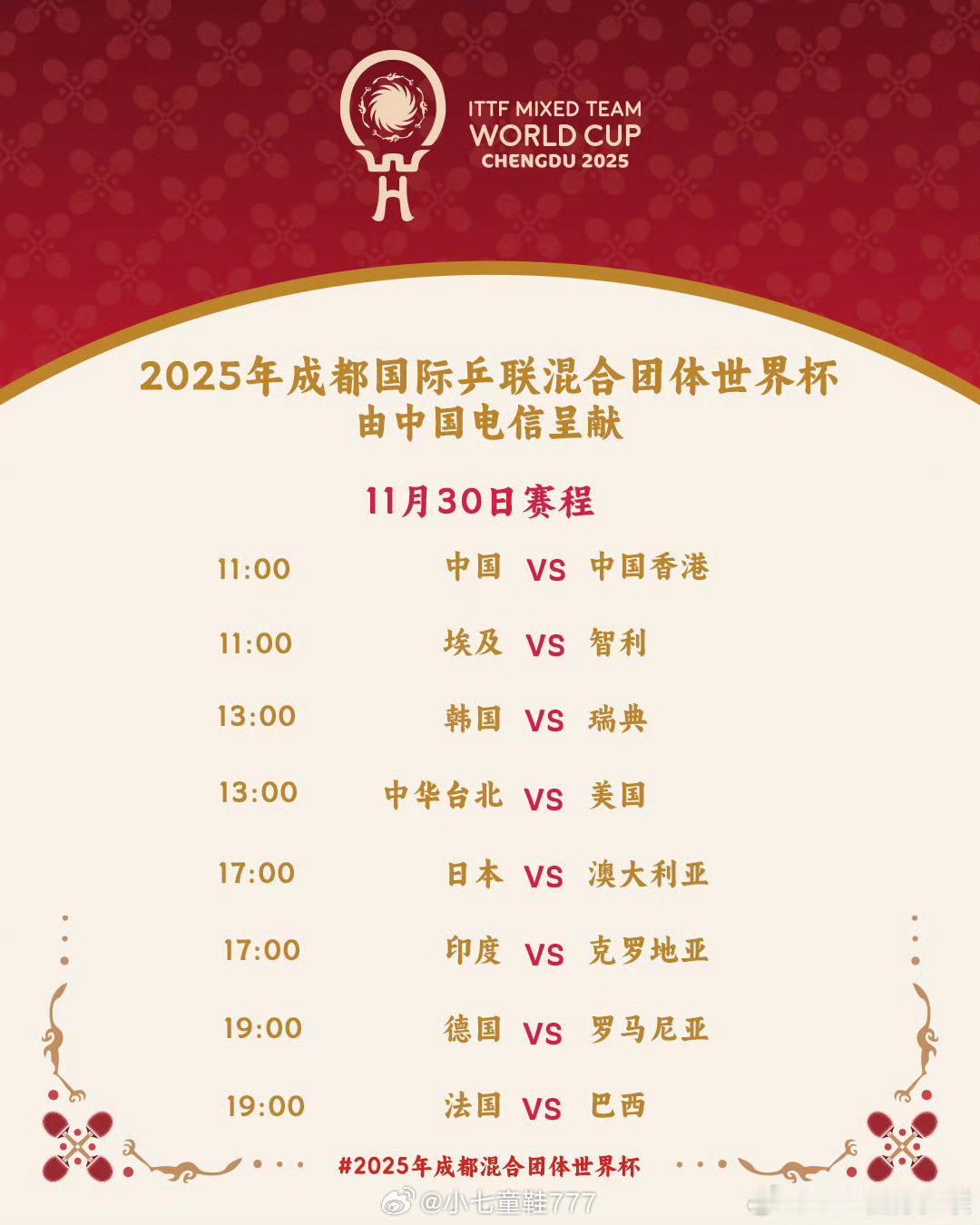 2025成都混合团体世界杯11月30日赛程11:00,1号台,中国vs中国香港 11:00,2号台,埃及vs智利13:00,1号台,韩国vs瑞典13:00,2号台,中国台北vs美国17:00,1号台,印度vs克罗地亚17:00,2号台,日本vs澳大利亚19:00,1号台,德国vs罗马尼亚19:00,2号台,法国vs巴西乒乓混团中国埃及香港智利同组混团世界杯中国vs中国香港体坛风云