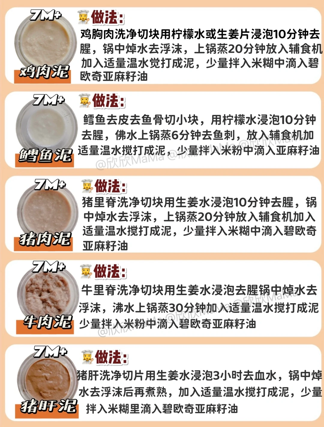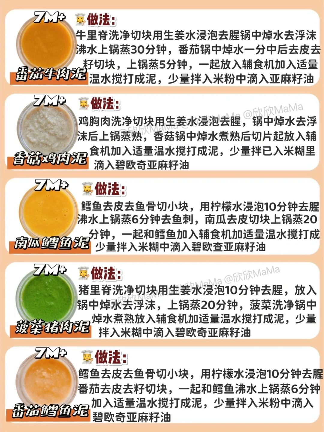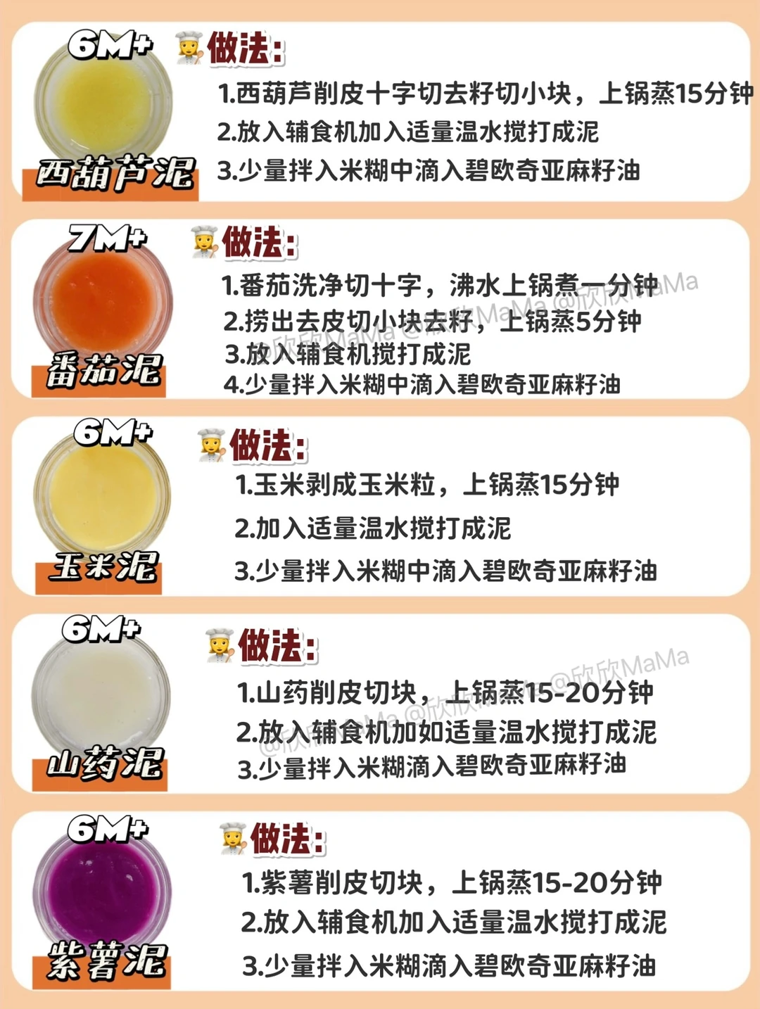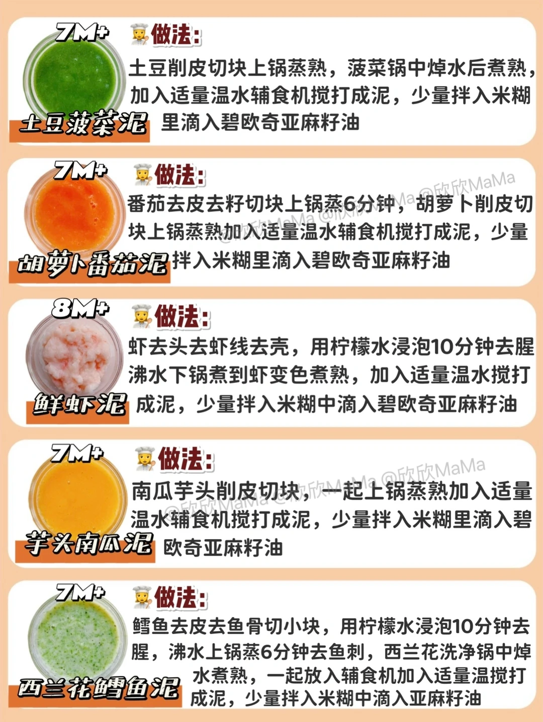 ⚠️ 每添加一种食材3天排敏期,如辅食泥第一天1-2勺,第2天2-3勺逐渐增加拌入米粉里滴入核桃油搅拌食用,水果泥单独吃!