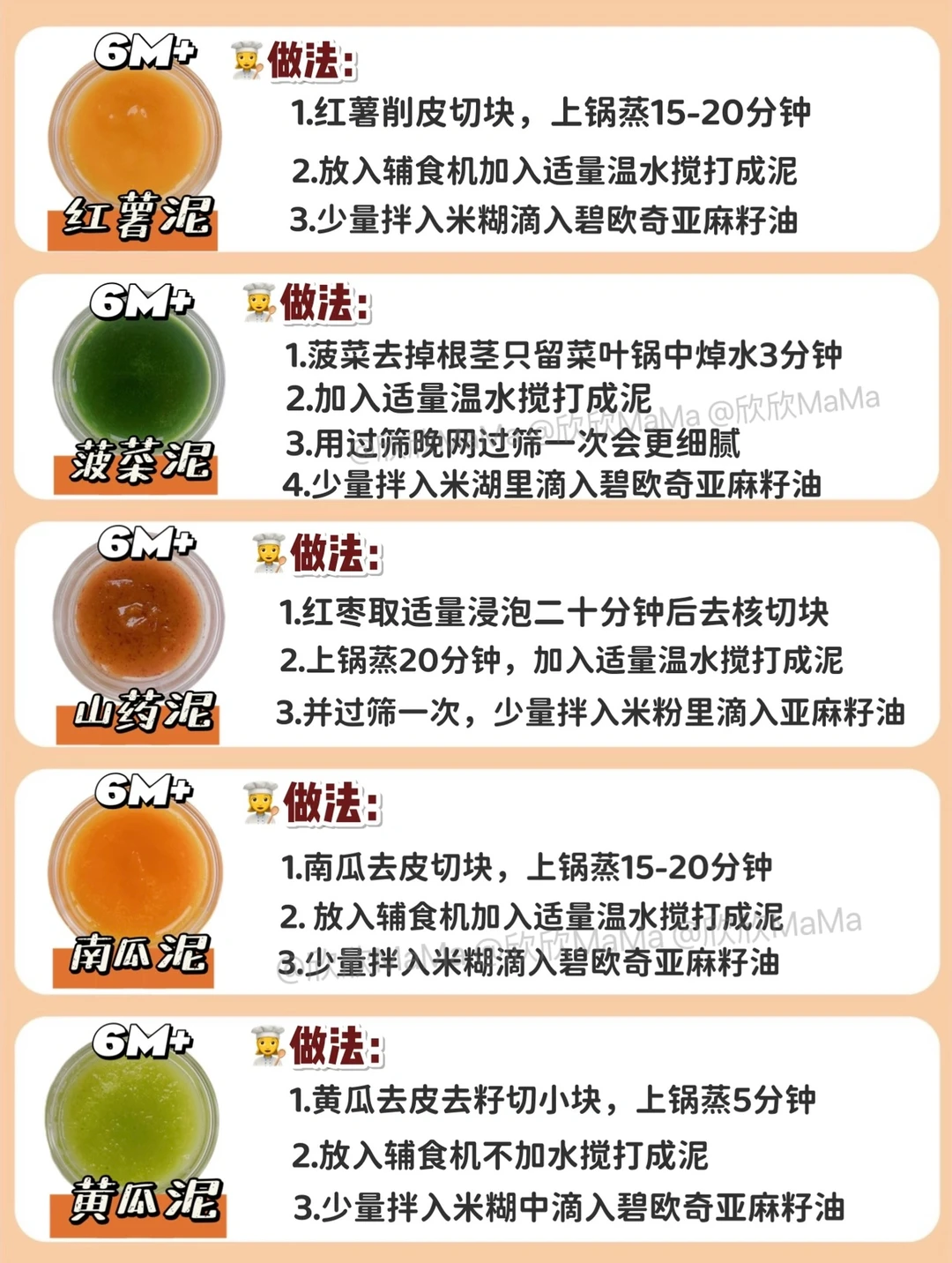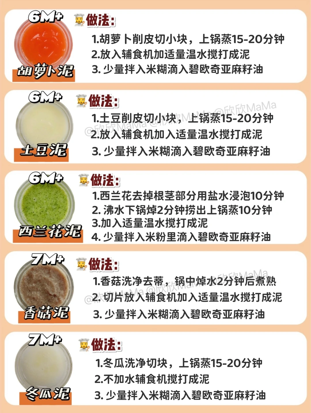 6月龄的宝宝就可以添加辅食了!但作为新手妈妈,辅食该怎么添加?6月龄应该吃什么?7月龄应该怎么吃?今天跟大家分享下30款常见辅食泥的做法,希望整理的对你们有用~