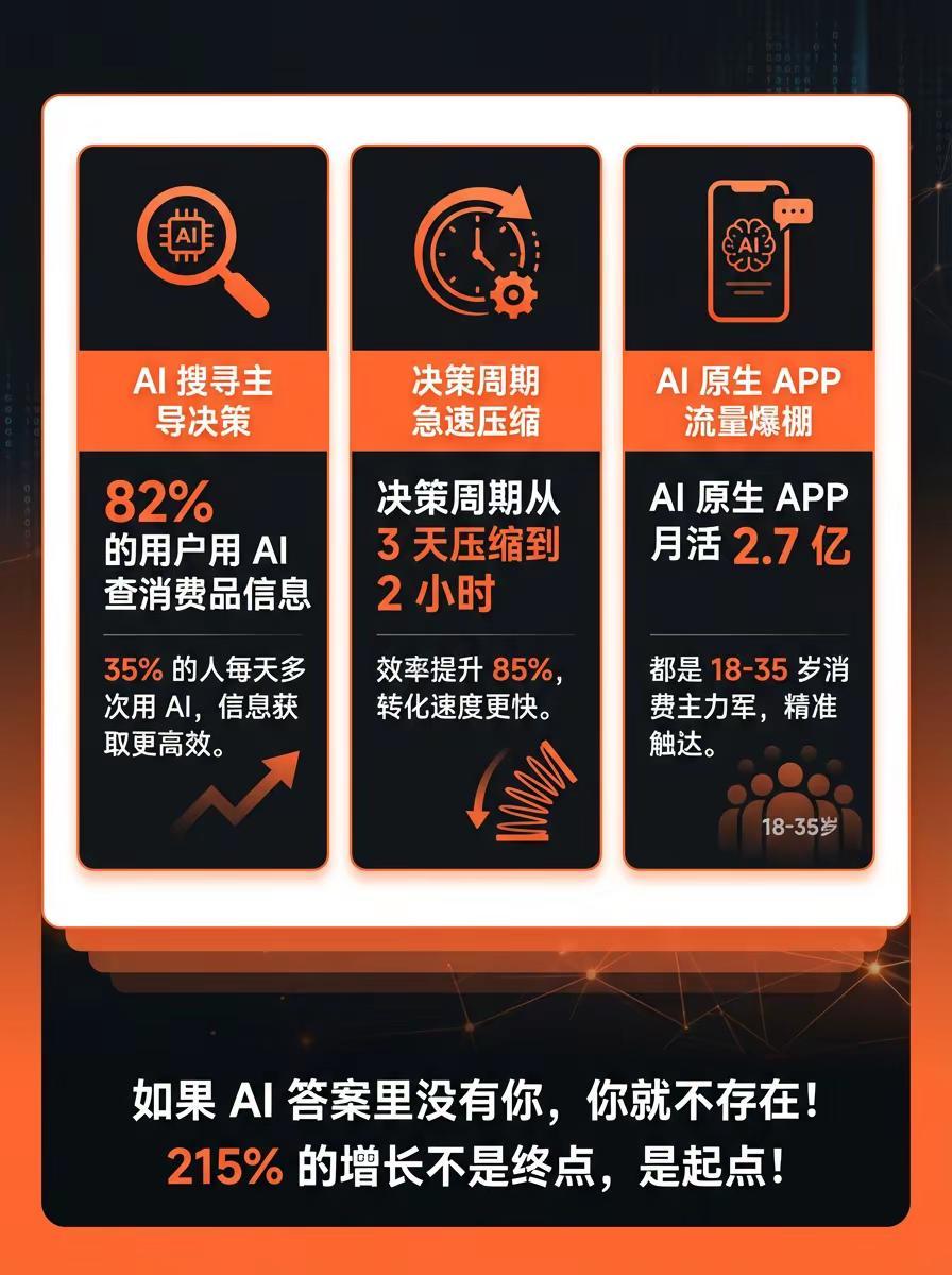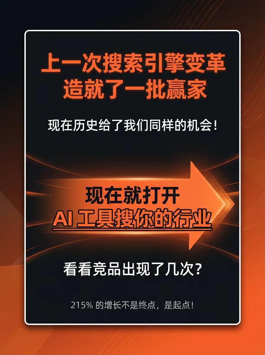 GEO市场暴涨 215%!。你的客户正在 AI 里找你!三个信号告诉你流量格局正在重塑:第一,82% 的用户用 AI 查消费品信息,35% 的人每天多次用 AI!第二,决策周期从 3 天压缩到 2 小时,效率提升 85%!第三,AI 原生 APP 月活 2.7 亿,都是 18-35 岁消费主力军!如果 AI 答案里没有你,你就不存在!215% 的增长不是终点,是起点!上一次搜索引擎变革造就了一批赢家,现在历史给了我们同样的机会!现在就打开 AI 工具搜你的行业,看看竞品出现了几次? GEO GEO优化 AI推荐 AI搜索