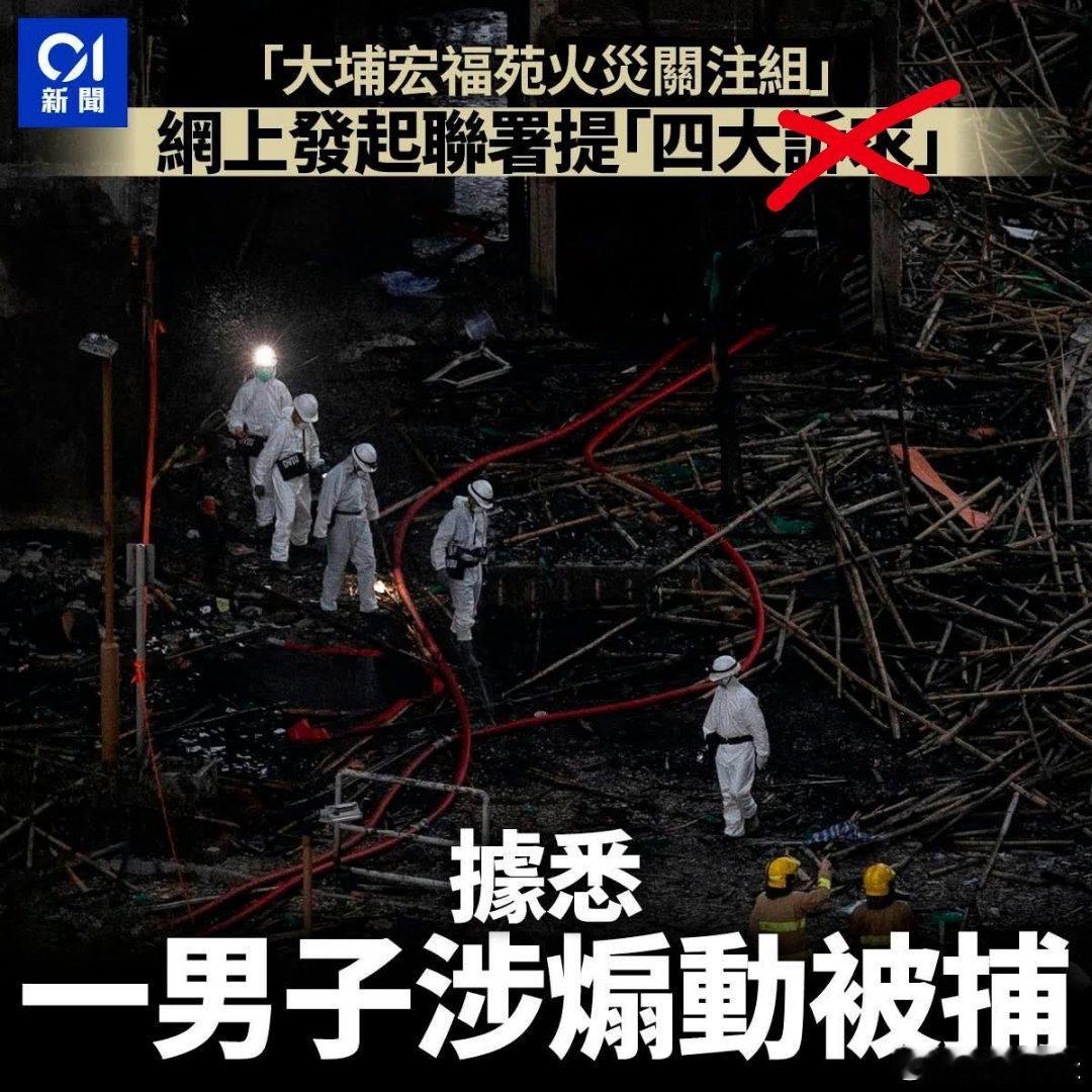 利用火灾提「四大素球」政治口号,一男子涉煽动被捕香港大埔11月26日发生致命大火,其后有自称「大埔宏福苑火灾关注组」的账号在网上发文,提出「有关大埔宏福苑五级火灾的四大素球」及发起联署。香港01报道,警方周六(29日)拘捕一名涉煽动男子。至于有关网上联署已停止,「大埔宏福苑火灾关注组」的社交媒体亦已关闭。反中乱港分子恶意攻击救援工作香港火灾遇难者家属发声